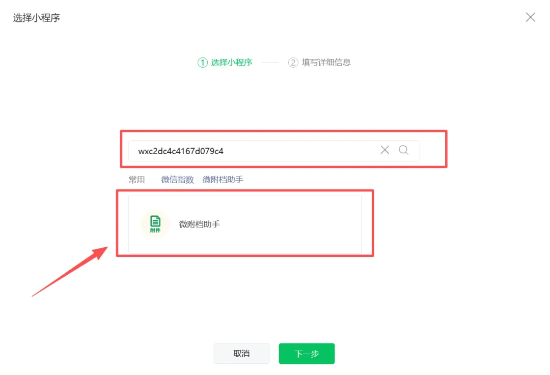 然后直接复制小程序ID插入,搜索选择微附档助手小程序即可。
