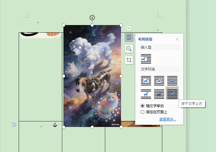 选择“浮于文字上方”,图片显示完整: