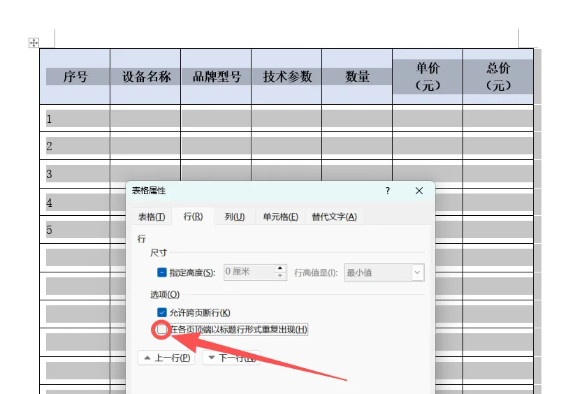 1、选中表头行,用鼠标选中表格的第一行(或前几行);右键单击选中的行,在弹出的快捷菜单中选择 “表格属性”。2、在弹出的“表格属性”对话框中,切换到 “行” 选项卡。勾选 “在各页顶端以标题行形式重复出现” 选项。点击 “确定” 保存设置。