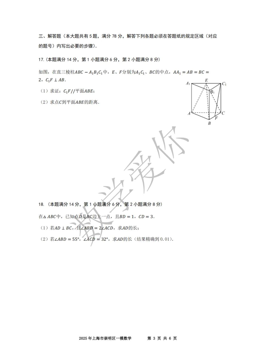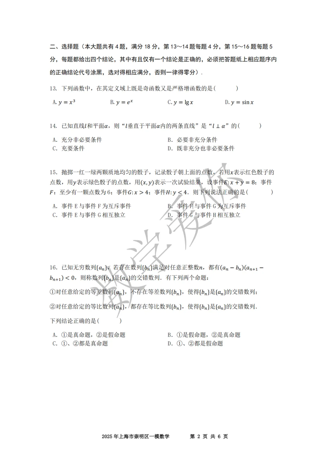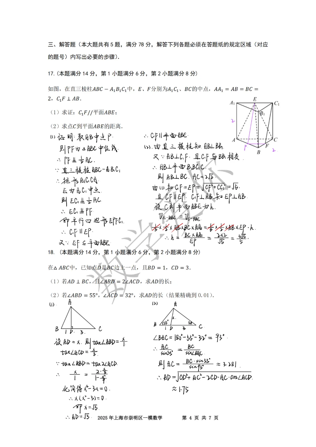 >2025崇明高三一模数学(word+手写解析)
