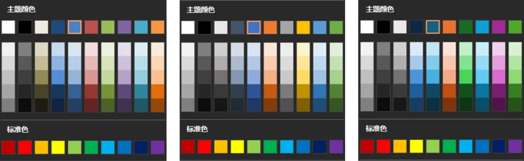 很多经常制作PPT的人,其实也没有认真了解过,PowerPoint的主题颜色发生过什么变化。从Office 2007开始,默认主题颜色就已经有了很大程度的改进。迄今为止的Office 2007、2013、2024三版默认配色,都适当降低了色彩的饱和度,以适应电子显示设备的呈现效果;同时色彩之间的对比度也进一步增强,直接使用新的默认配色,会比盲目而刻意地选用标准色更科学。