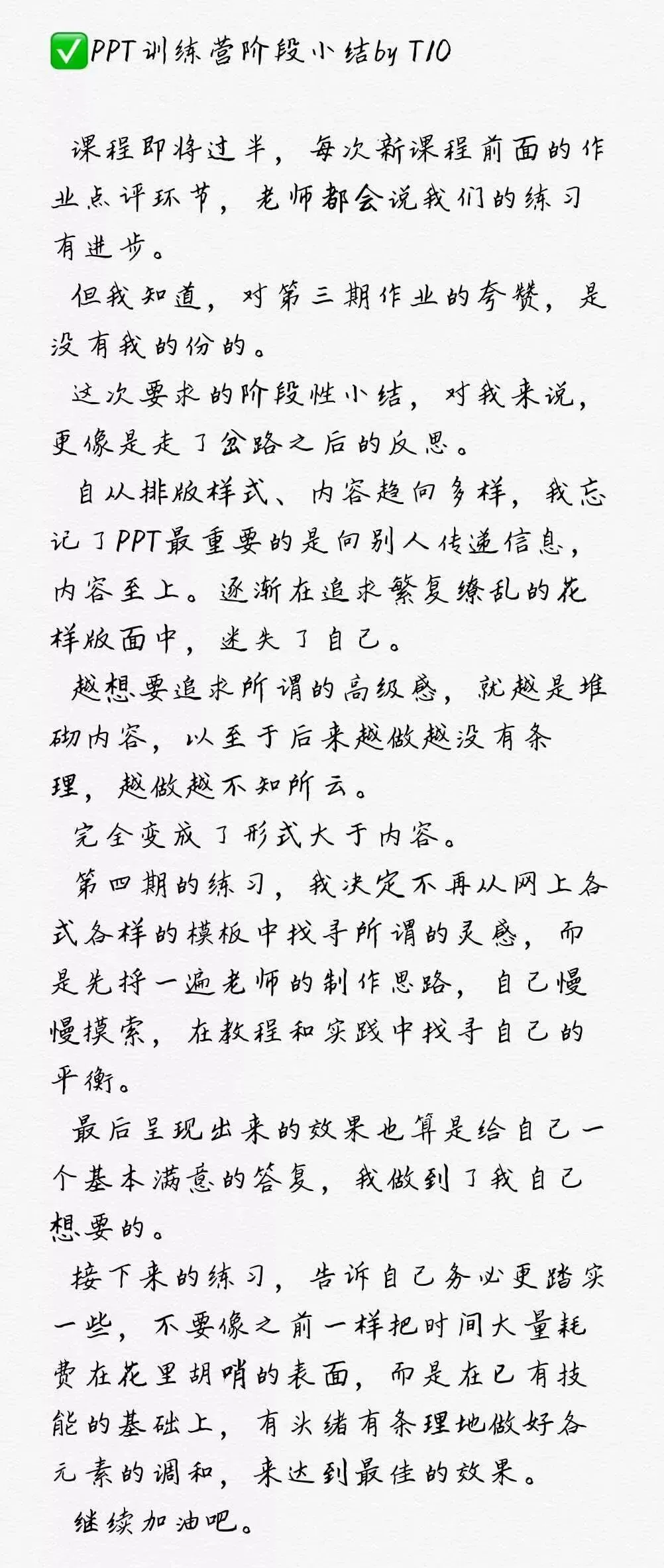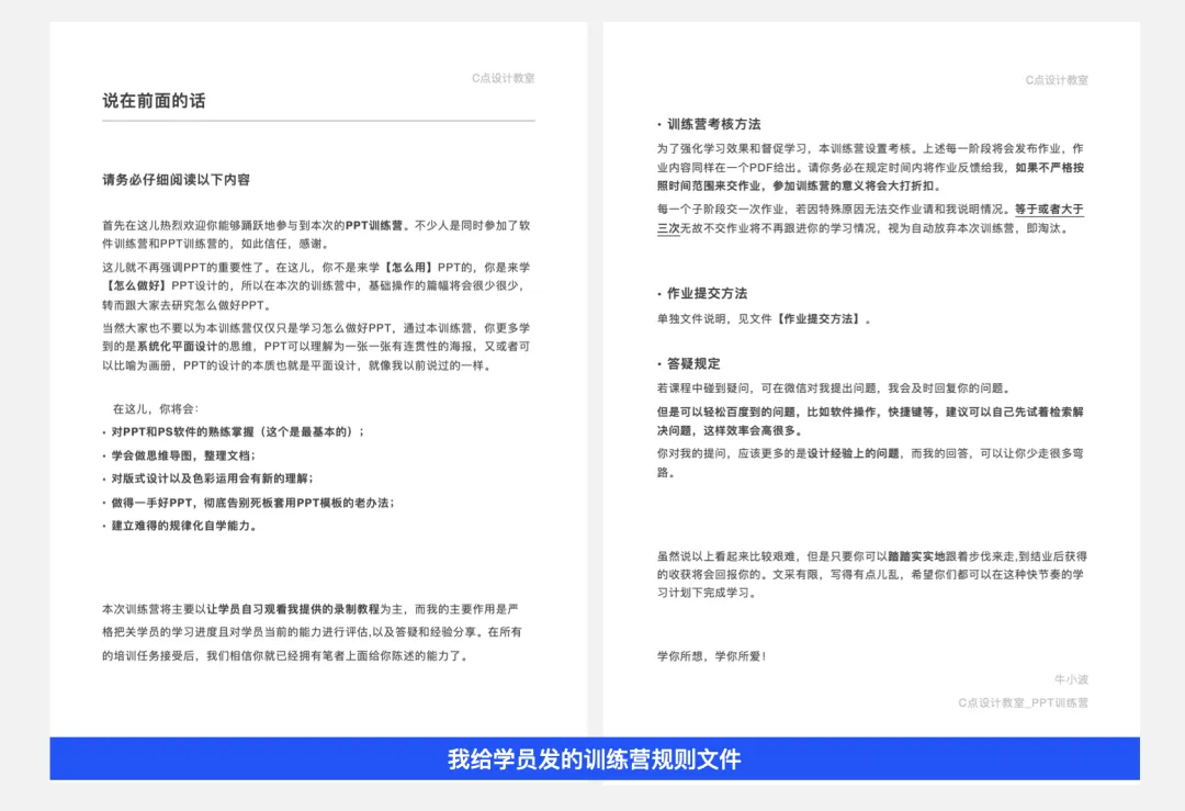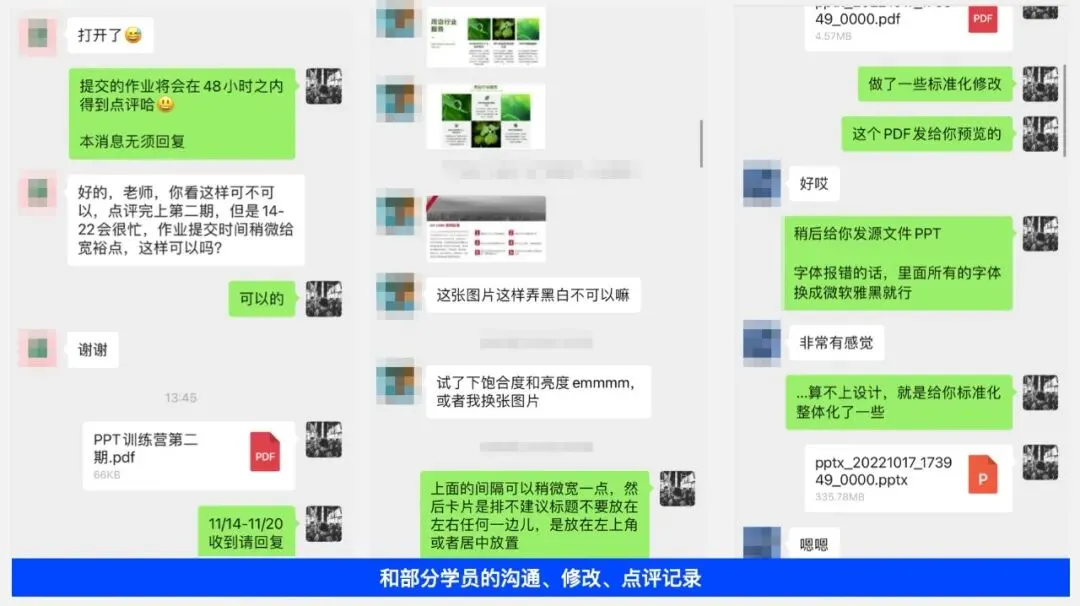 PPT的训练营是完全的「一对一」模式,我直接对你发布学习任务和作业点评。当期任务没有通过,得反复做直到满意为止,以达到最佳教学效果。