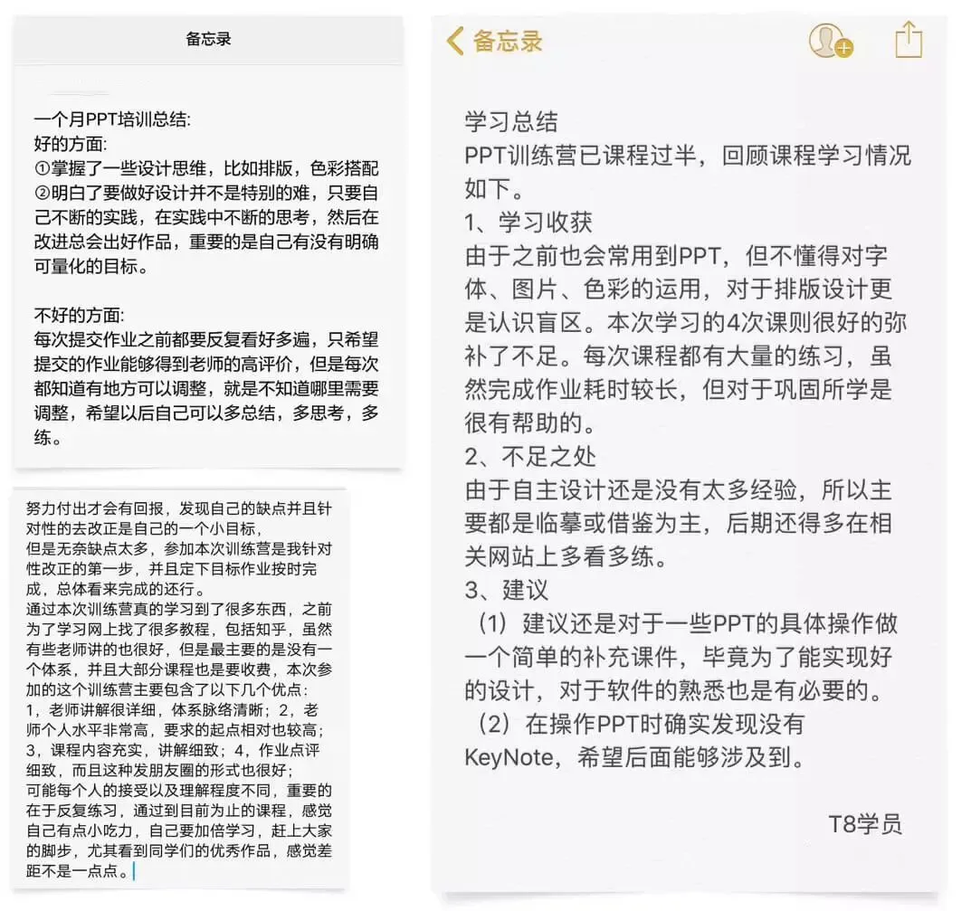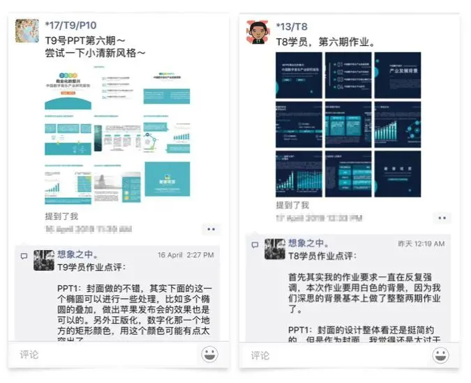 学的东西需要巩固,所以当然会有作业,此外作业上传之后都会得到点评。另外我经常帮学员指点他们学习、工作中需要制作的PPT,这都是训练营承诺的一部分。