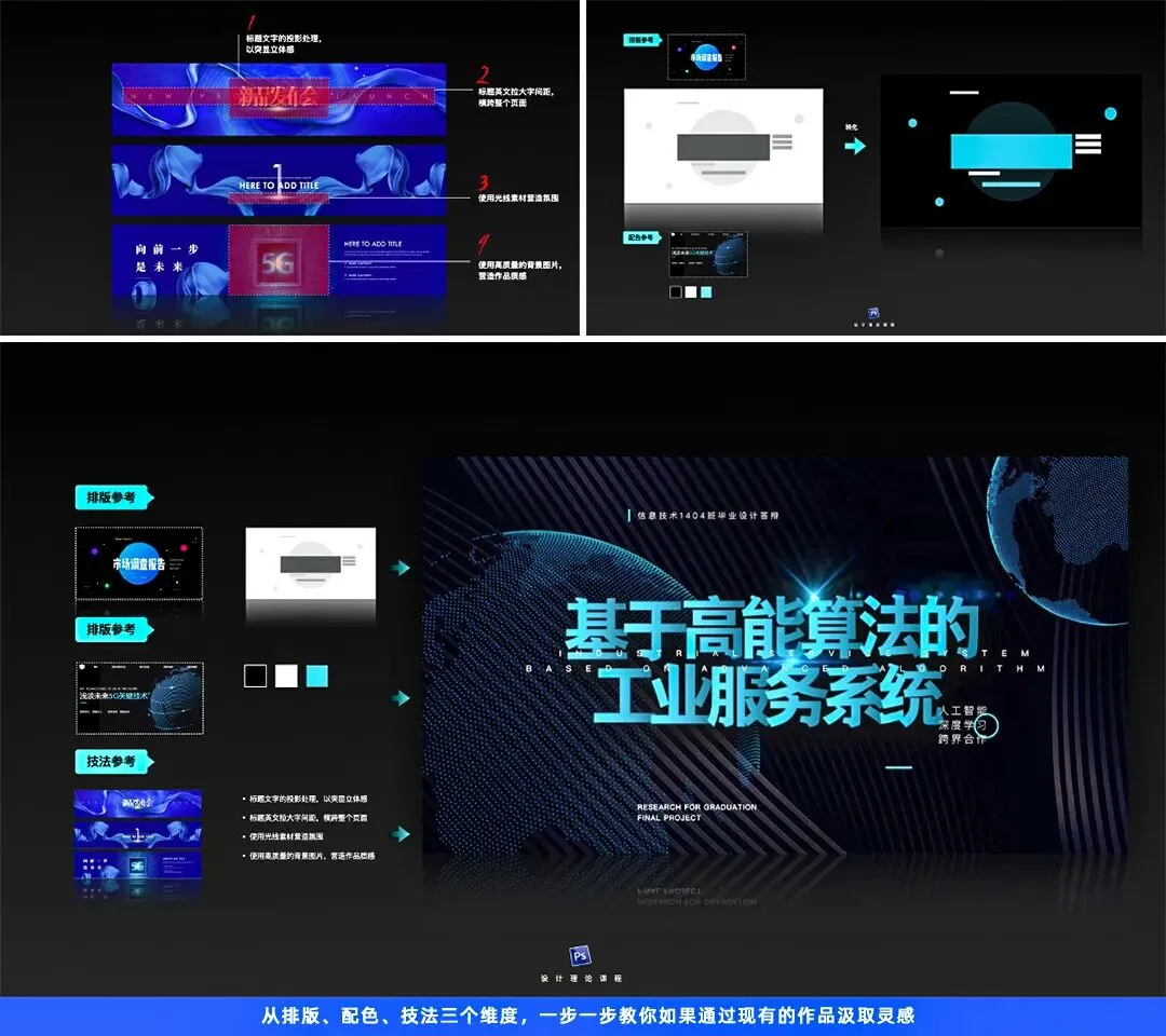 比如下面训练营课程中的例子,从排版、配色、技法三个维度,一步一步教你如果通过现有的作品汲取灵感,生动且实际地教你作品的建立思路: