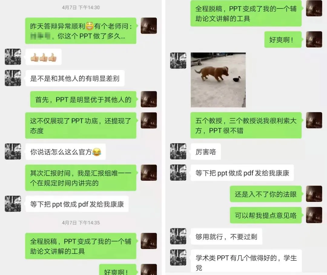 我的一个大学同学,也参加了我的PPT训练营,学完之后,自己设计的答辩PPT,让台下的导师刮目相看: