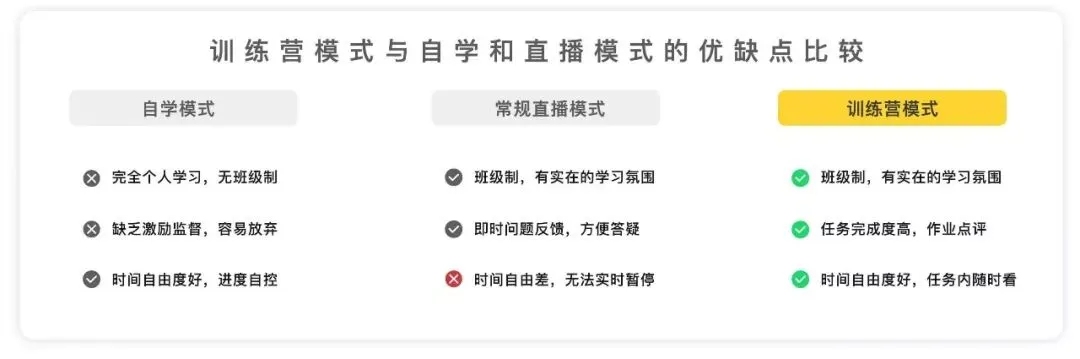 而训练营模式就可以很好的吸收这些优缺点,都在下面这张图啦。