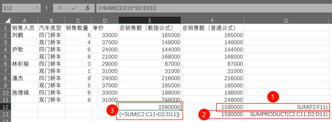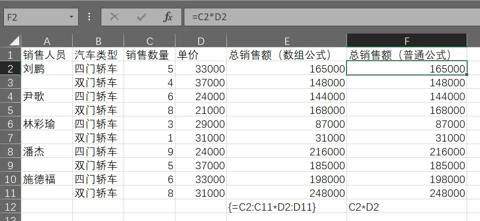 举例说明,计算每个销售人员的各汽车类型的总销售额,按照普通公式不采用数组公式的方式,就按照F列的方式,选中F2单元格输入=C2*D2然后回车后进行自动填充。