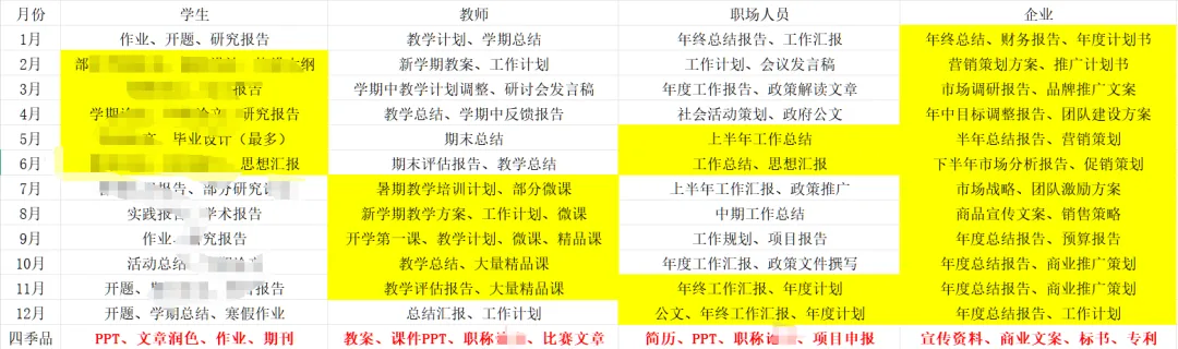 抽空把市场需要按时间和人群制作了一个表格,让大家可以直观的了解