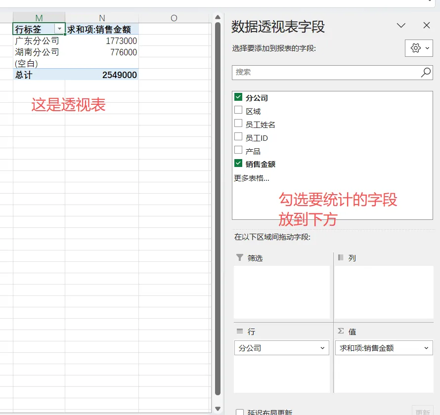 ④拖动要统计的字段,到下面方框,透视表会自动生成
