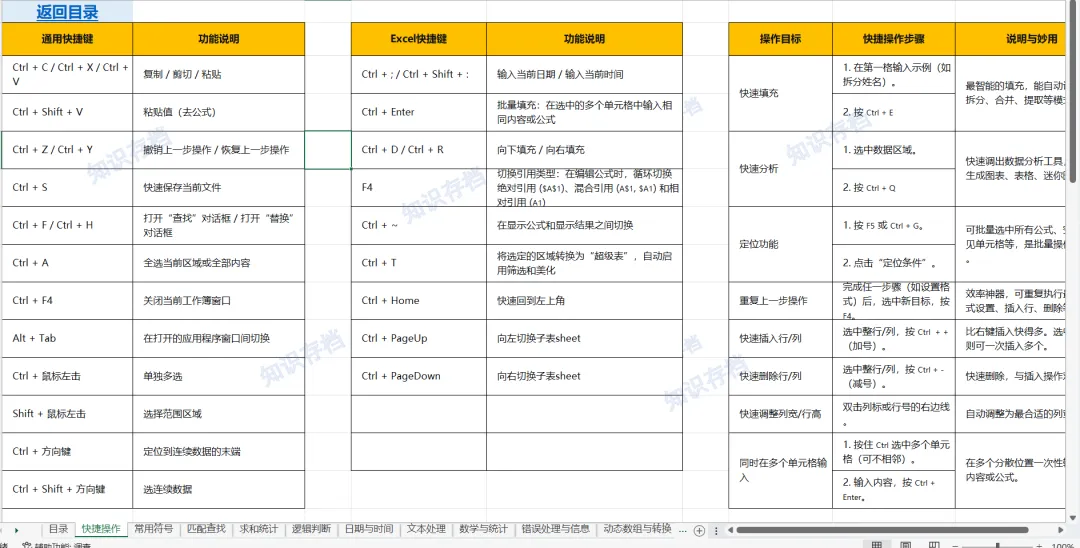 常用快捷键、符号、函数公式、数据透视、数据分列等