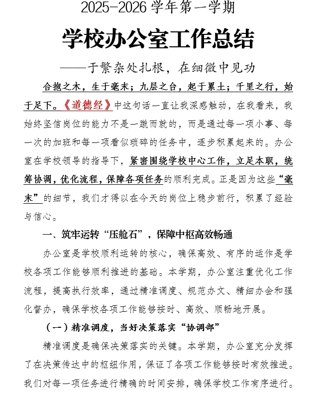 2025-2026学年第一学期,学校办公室围绕“于繁杂处扎根,在细微中见功”的理念,系统推进各项工作,为学校高效运转提供了坚实保障。