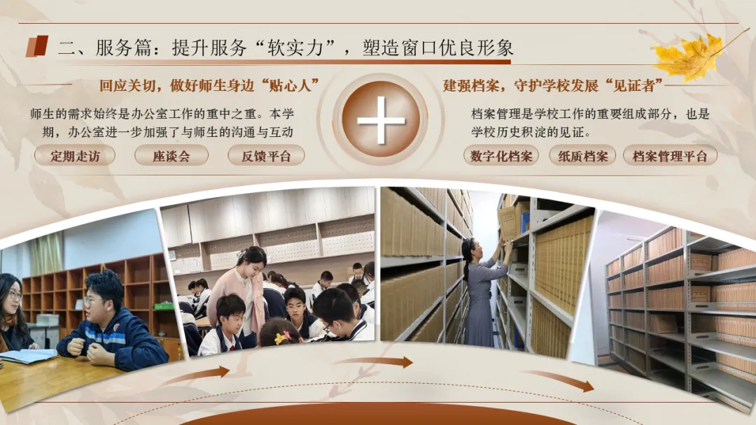 优化接待流程,展现“东道主”热情,提升学校对外形象。畅通信息联络,构建上传下达“直通车”,确保信息高效传递。积极回应师生关切,做好“贴心人”,增强归属感。加强档案管理,守护学校发展“见证者”,实现纸质与电子档案同步归档。