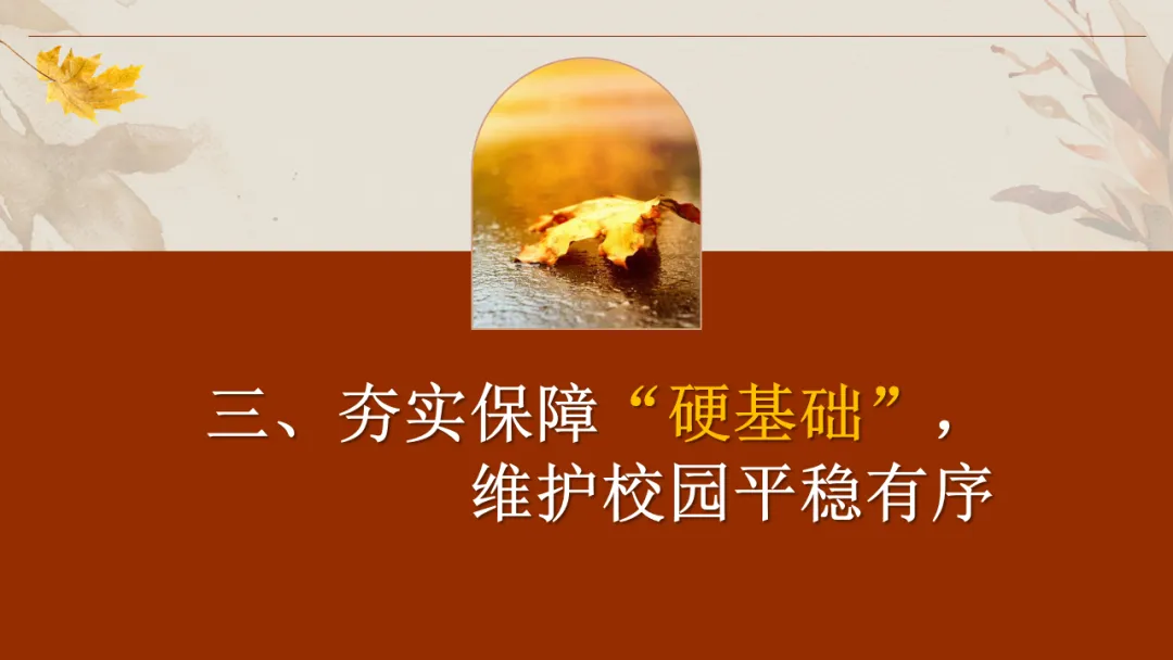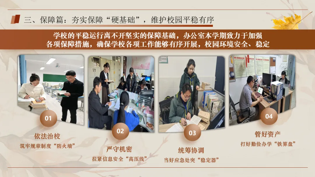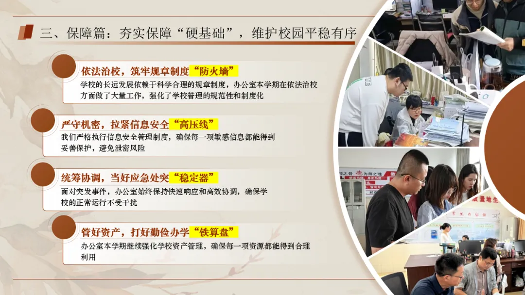 完善规章制度,筑牢依法治校“防火墙”。严守信息安全“高压线”,加强保密培训与演练。统筹应急处突,当好“稳定器”,快速响应各类突发事件。精细资产管理,打好“铁算盘”,实现资源合理利用与节约。