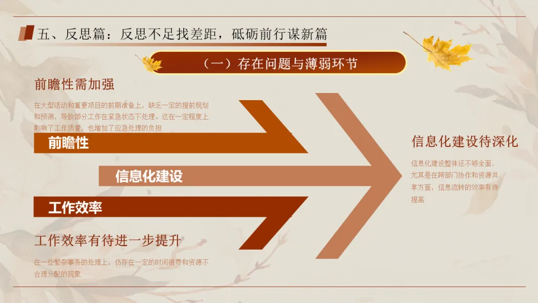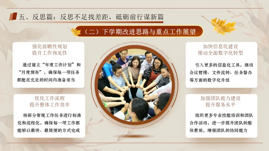 工作中仍存在前瞻性不足、信息化建设待深化、部分流程效率不高等问题。下学期将重点加强前瞻规划、加快数字化转型、优化工作流程,并持续提升团队专业素养与服务效能。