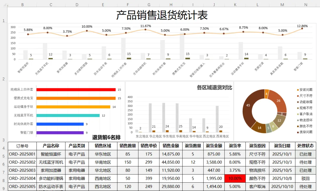 表格涵盖从订单号、产品信息、销售区域到退货原因、处理状态等完整字段,无需跨表整理,所有数据一表搞定。