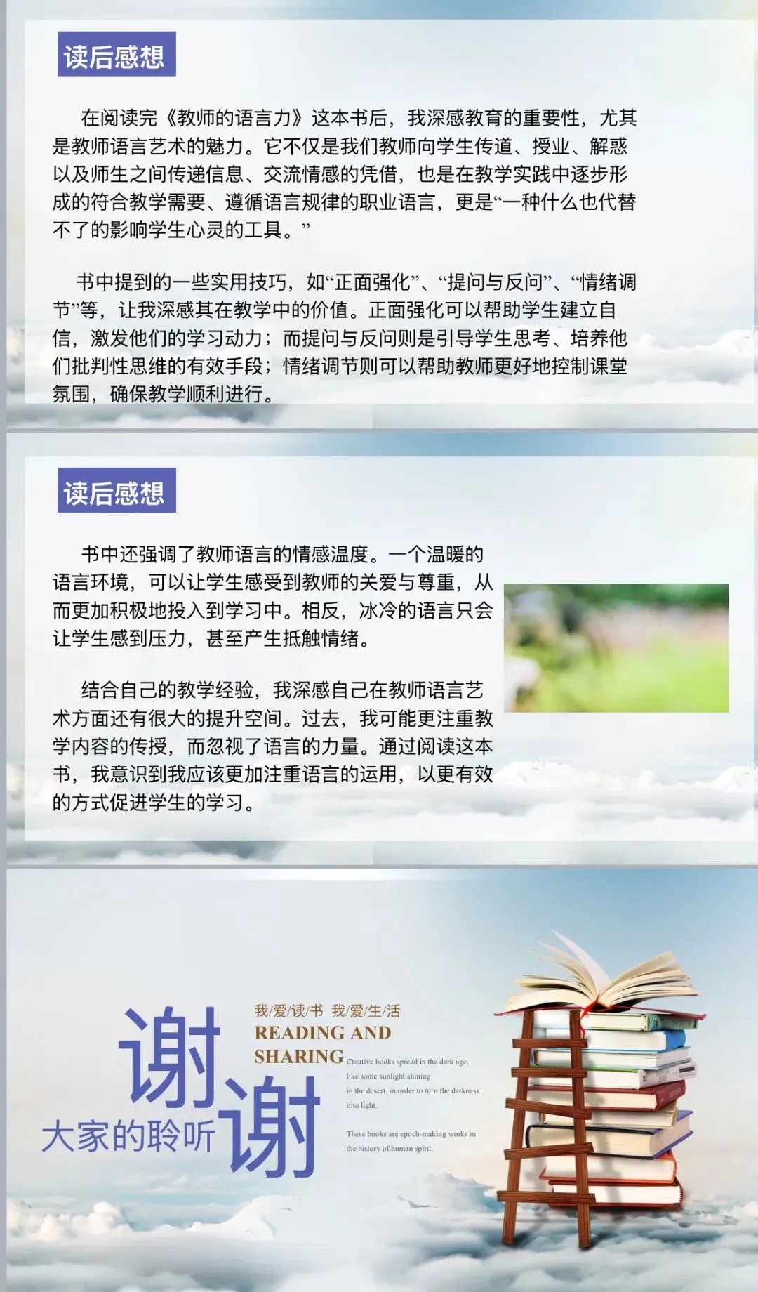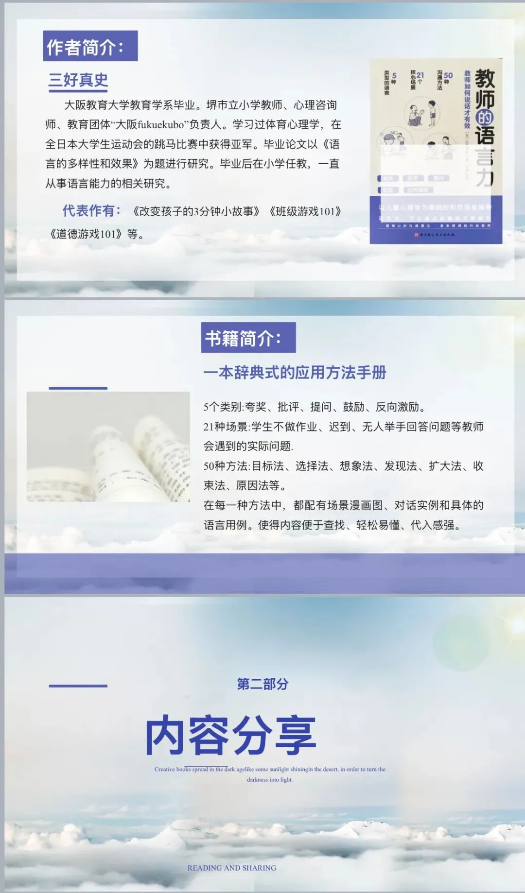 《教师的语言力》这本书,宛如一盏明灯,在教育的暗夜中闪耀,为教师们照亮前行的道路。今天,我将围绕这本书,与大家深入交流探讨。