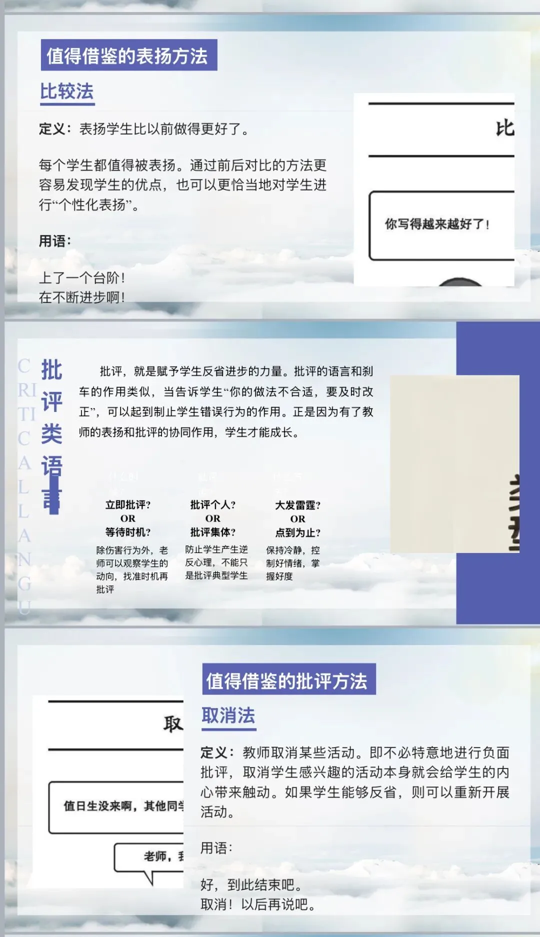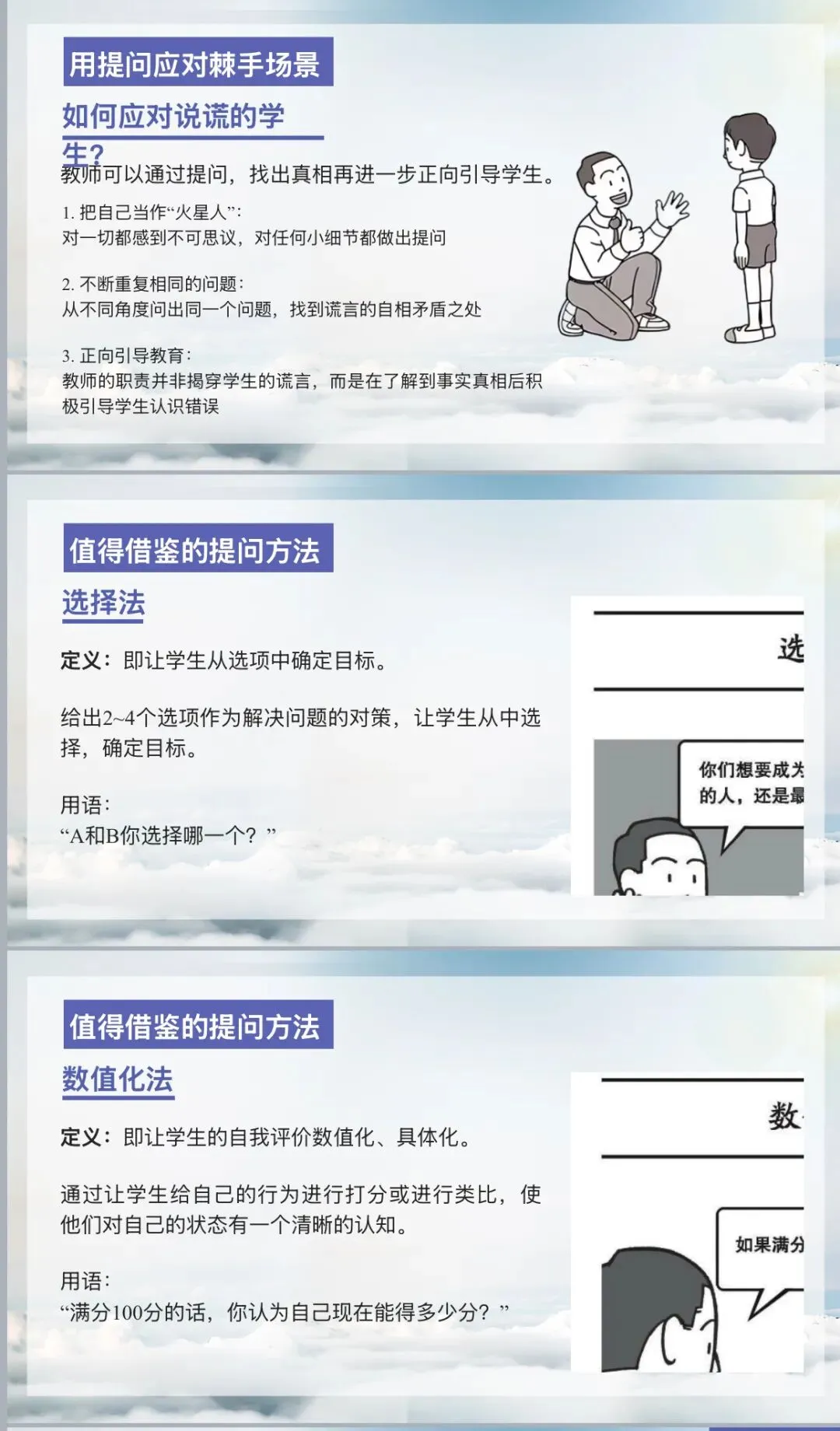 鼓励类语言则如同春风化雨,能够发掘学生的潜力,让他们更加自信地超越自我。书中提醒教师避免空洞的套话,要基于对学生理解的基础上表达关切,并给出方向性指引。它还介绍了 “目标法” 这一鼓励方式,即让学生从选项中确定目标,如 “这次考试,你是想达到 80 分还是 85 分呢”,让学生明确努力方向,增强动力。此外,“自我评价数值化” 的方法也十分实用,通过让学生给自己的行为打分或类比,使其清晰认知自我状态,从而有针对性地改进。