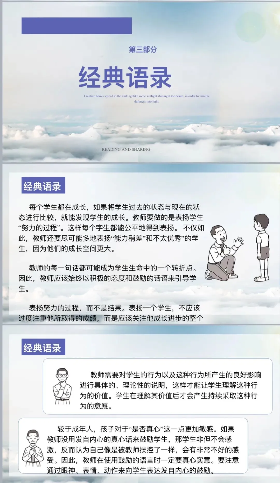 书中的经典语录更是发人深省。“每个学生都在成长,教师要做的是表扬学生‘努力的过程’”,这句话让我们明白,关注学生的成长过程远比只看重结果更为重要。还有 “教师的每一句话都可能成为学生生命中的一个转折点”,警醒着我们教师肩负着重大的责任,要用积极的态度与鼓励的话语引导学生。