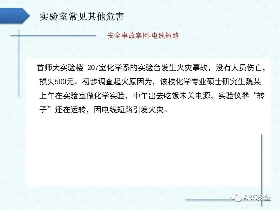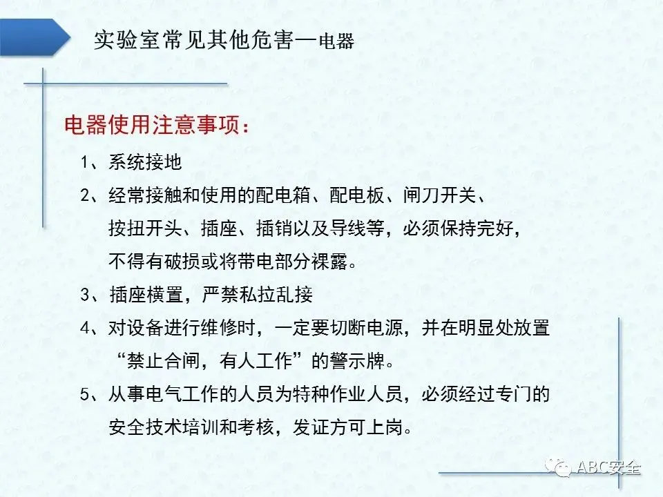 3.使用电器设备(如烘箱、恒温水浴、离心机、电炉等)时,严防触电;绝不可用湿手或在眼睛旁视时开关电闸和电器开关。应该用试电笔检查电器设备是否漏电,凡是漏电的仪器,一律不能使用。
