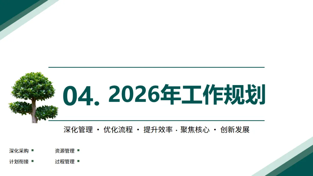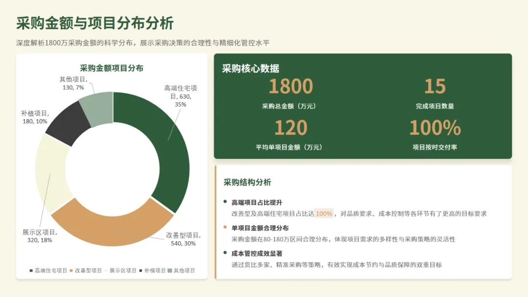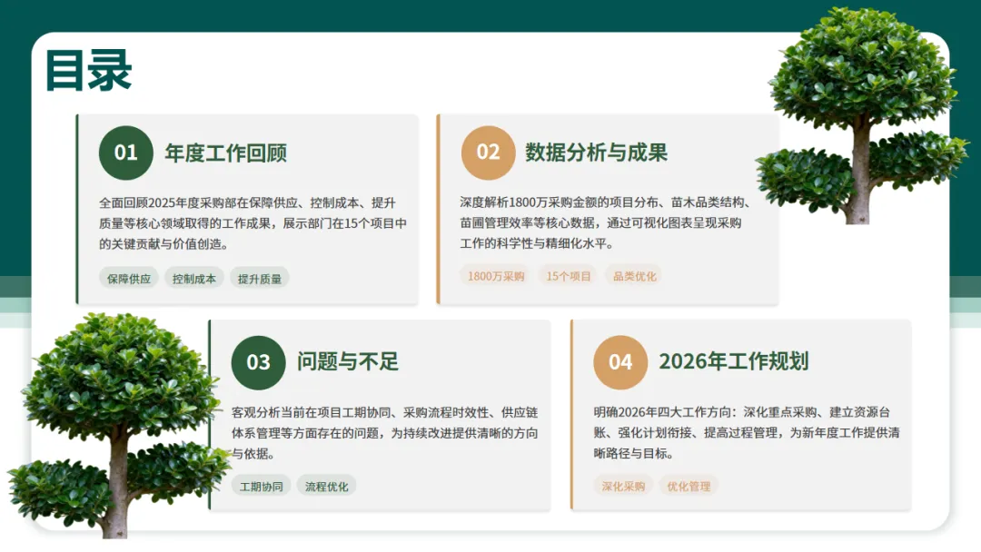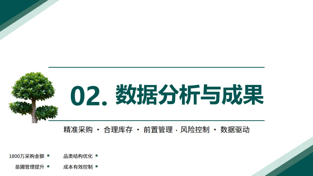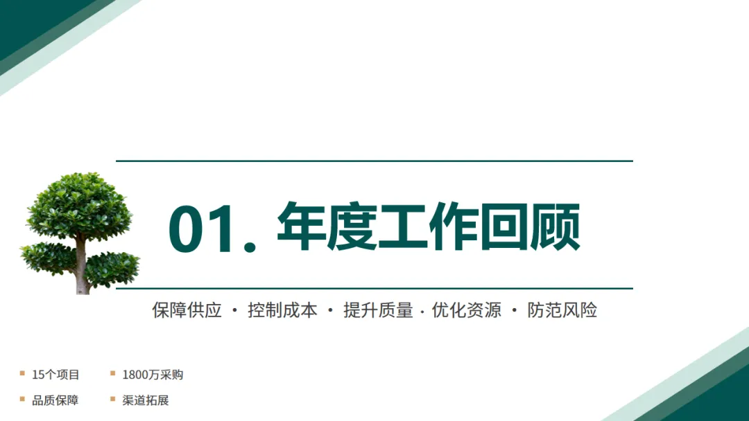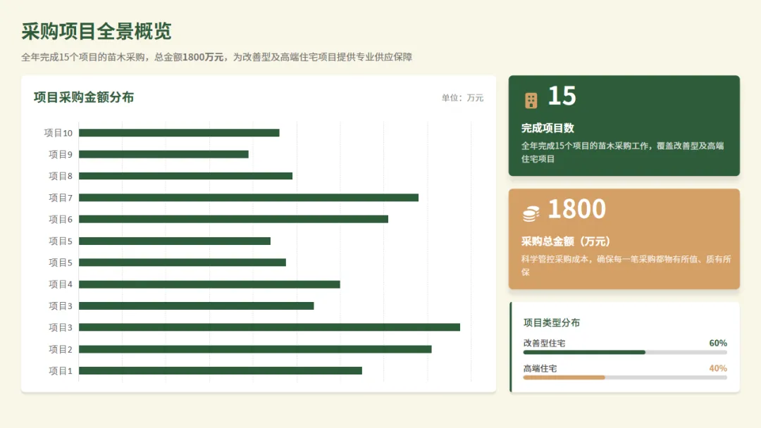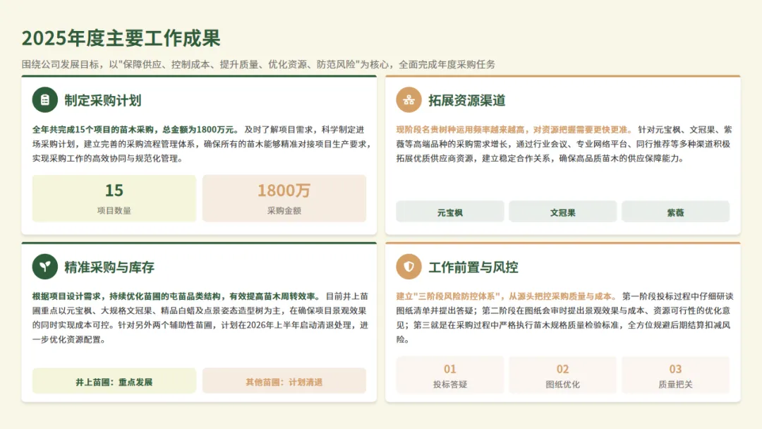 1、制定采购,保障供应:全年共完成15个项目的苗木采购,总金额为1800万元,及时了解项目需求,制定进场采购计划,确保所有的苗木能满足对应项目生产要求。