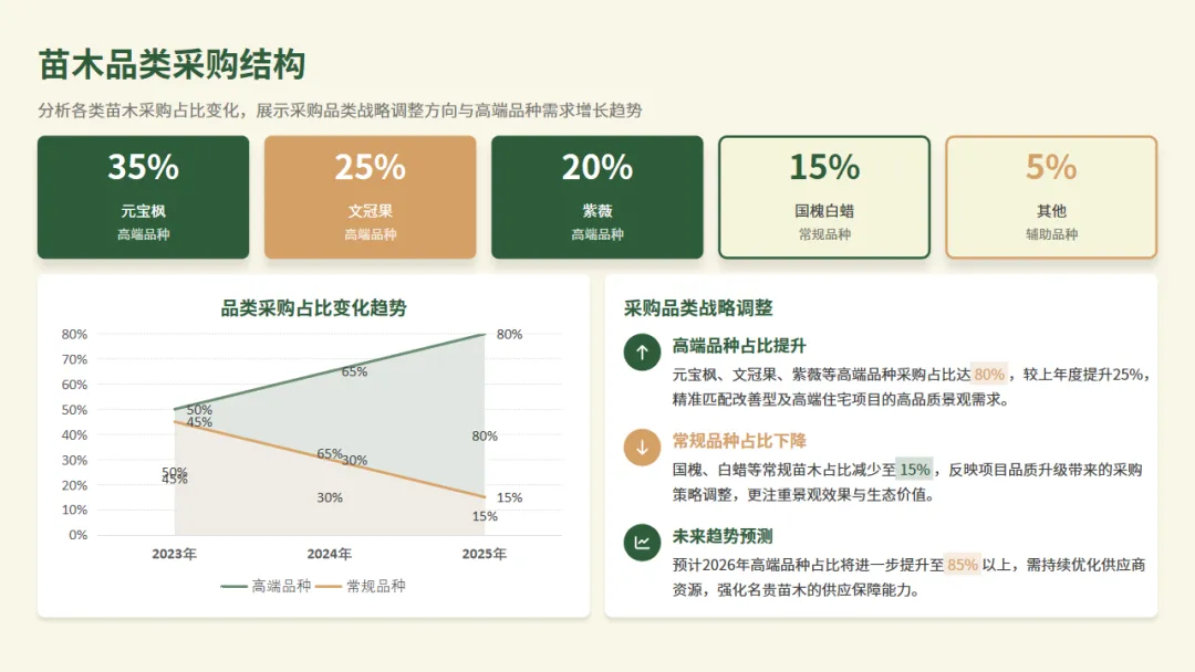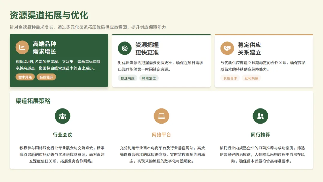 2、拓展渠道,货比N家:现阶段相对名贵的元宝枫、文冠果、紫薇等运用频率越来越高,像国槐白蜡常规苗木的占比减少,因此对我们资源的把握需要更快更准;通过行业协会、网络平台、同行推荐等多种渠道来拓展资源