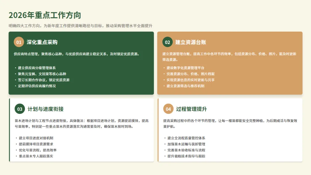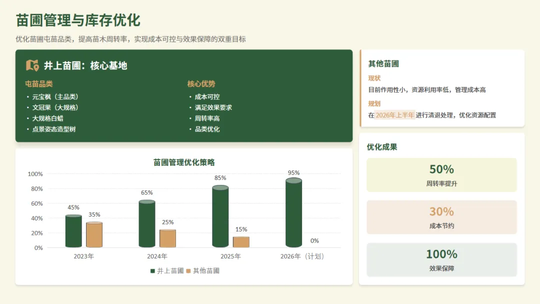 3、精准采购,合理库存:根据项目设计需求,优化苗圃的屯苗品类,提高苗木周转率;目前井上苗圃以元宝枫、文冠果、大规格白蜡、点景姿态造型树为主,成本可控同时又能满足效果要求。另两个苗圃目前作用性小,在2026年上半年进行清退处理。
