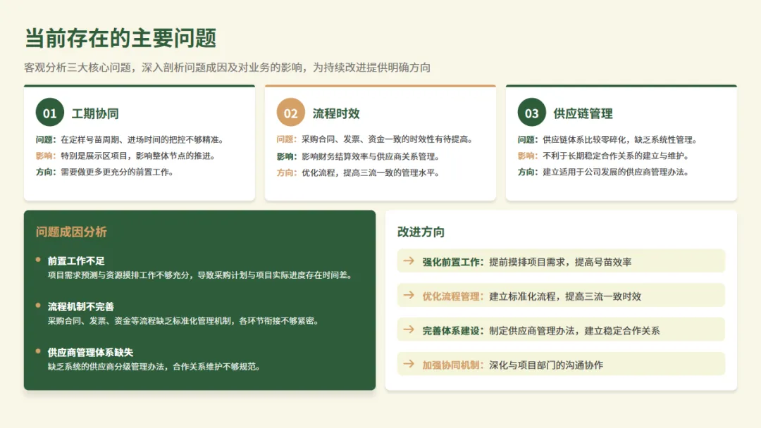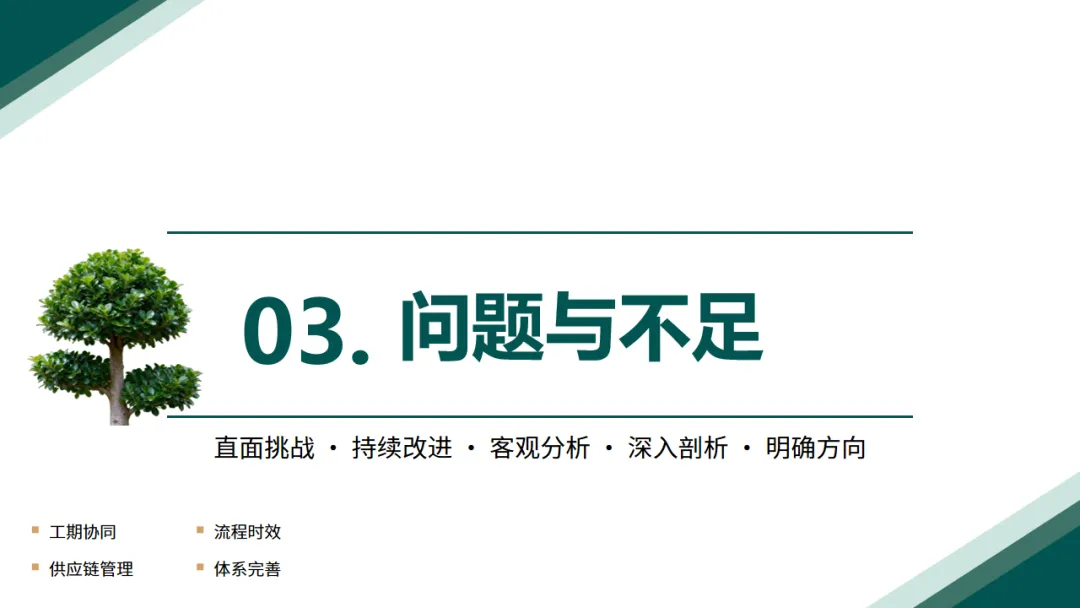 1、项目工期的协同性仍待加强:在定样号苗周期、进场时间的把控不够,特别是展示区项目,影响整体节点的推进,需要做更多更充分的前置工作。