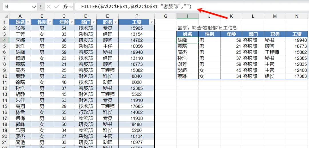 =FILTER($A$2:$F$31,$D$2:$D$31="客服部","")解析:array=$A$2:$F$31(全部数据),include=$D$2:$D$31="客服部"(D列等于“客服部”的行标记为TRUE),if_empty无结果时显示为空。