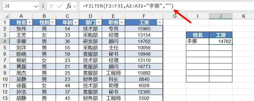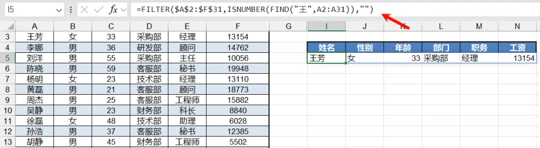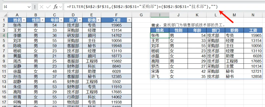 效果:自动返回所有销售部员工的整行数据,结果动态溢出到相邻单元格。