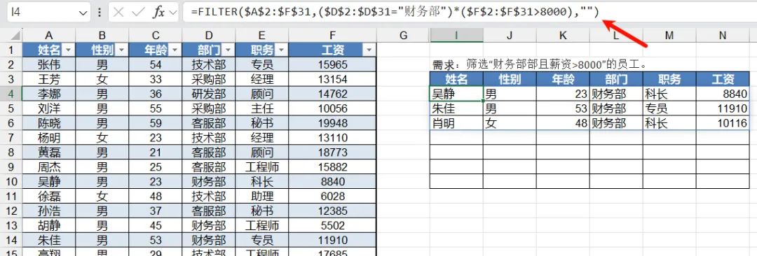 =FILTER($A$2:$F$31,($D$2:$D$31="财务部")*($F$2:$F$31>8000),"")解析:($D$2:$D$31="财务部")和($F$2:$F$31>8000)是两个逻辑数组,相乘后仅当两条件都为TRUE时结果才为TRUE(保留该行)。