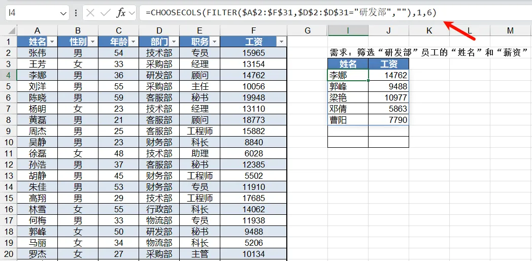 =CHOOSECOLS(FILTER($A$2:$F$31,$D$2:$D$31="研发部",""),1,6)解析:filter函数返回所有研发部的数据,然后通过chooseclos挑选出需要的姓名和工资列,最后最终结果。