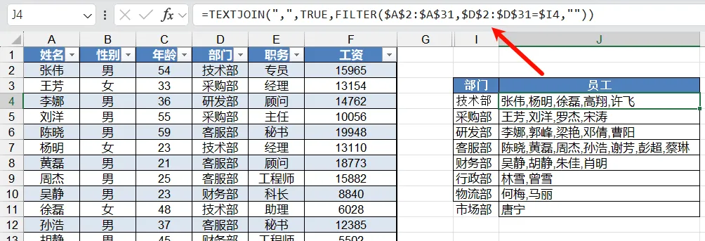 需求:将员工姓名按部门汇总到一个单元格,姓名之间用都逗号隔开。