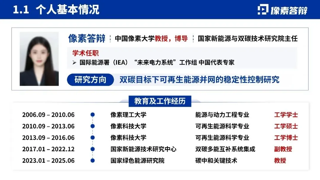 汇报人担任国家新能源与双碳技术研究院主任,国际能源署(IEA)“未来电力系统” 工作组的中国代表专家。教育与工作经历完整,从本科到博士深耕可再生能源领域,后续科研经历也紧扣 “双碳” 主题,资历扎实且国际视野突出。