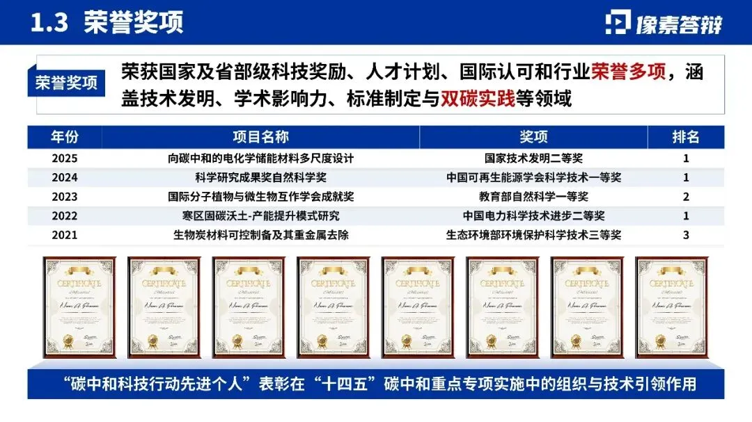 这是一份为新能源与双碳领域的 “科技创新领军人才” 评选准备的答辩汇报材料,整体风格专业严谨,内容系统全面,突出了候选人的学术实力、技术突破与战略价值。