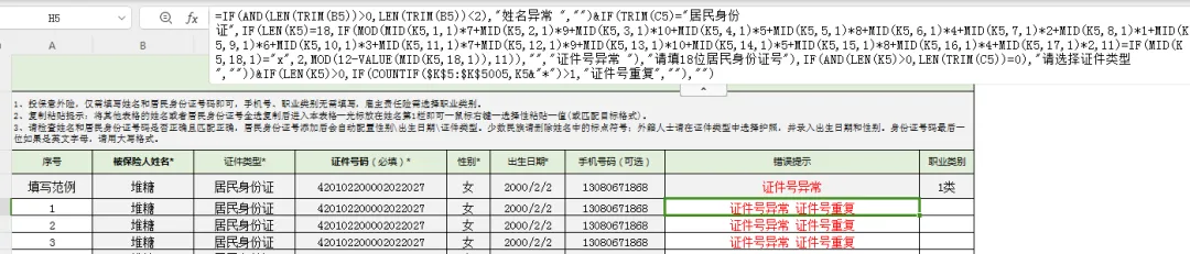 =IF(AND(LEN(TRIM(B5))>0,LEN(TRIM(B5))<2),"姓名异常 ","")&IF(TRIM(C5)="居民身份证",IF(LEN(K5)=18,IF(MOD(MID(K5,1,1)*7+MID(K5,2,1)*9+MID(K5,3,1)*10+MID(K5,4,1)*5+MID(K5,5,1)*8+MID(K5,6,1)*4+MID(K5,7,1)*2+MID(K5,8,1)*1+MID(K5,9,1)*6+MID(K5,10,1)*3+MID(K5,11,1)*7+MID(K5,12,1)*9+MID(K5,13,1)*10+MID(K5,14,1)*5+MID(K5,15,1)*8+MID(K5,16,1)*4+MID(K5,17,1)*2,11)=IF(MID(K5,18,1)="x",2,MOD(12-VALUE(MID(K5,18,1)),11)),"","证件号异常 "),"请填18位居民身份证号"),IF(AND(LEN(K5)>0,LEN(TRIM(C5))=0),"请选择证件类型 ",""))&IF(LEN(K5)>0,IF(COUNTIF($K$5:$K$5005,K5&"*")>1,"证件号重复",""),"")