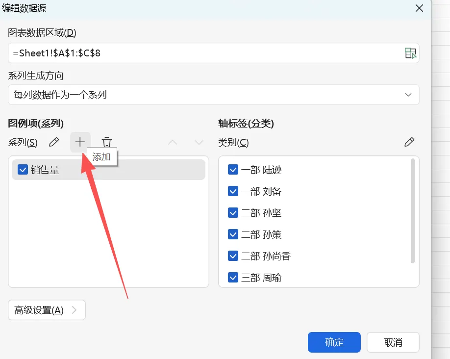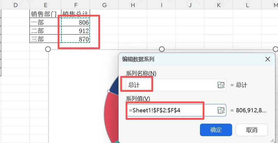 5、系列名填写为总计,系列值数据选择销售总计中的数据(F列的数据),完成点确定