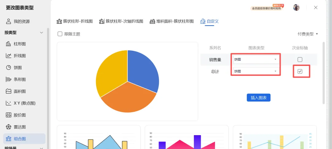7、点击左侧组合图,销售量,总计都选择饼图,总计勾选次坐标轴,选择完成,点击插入图表