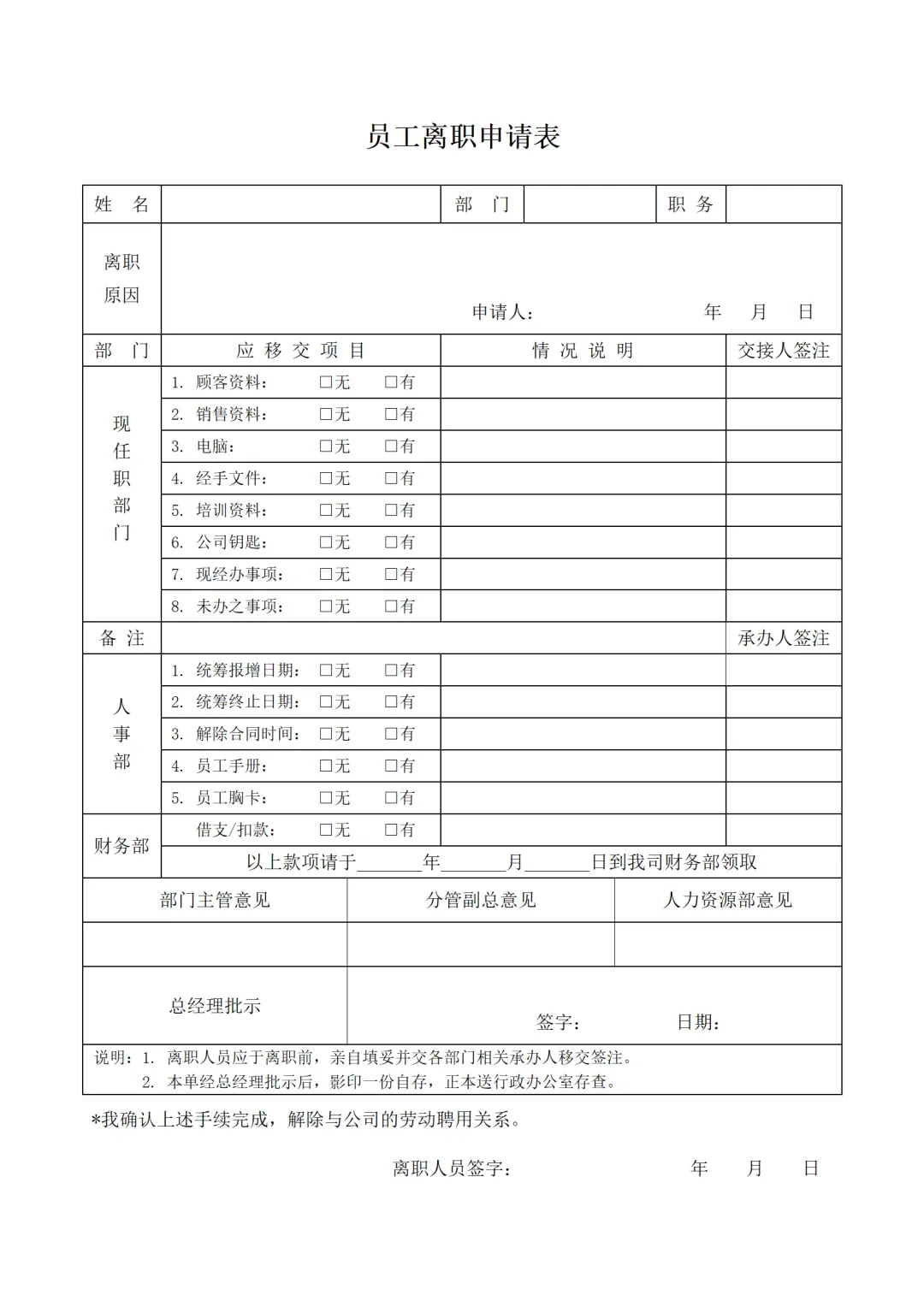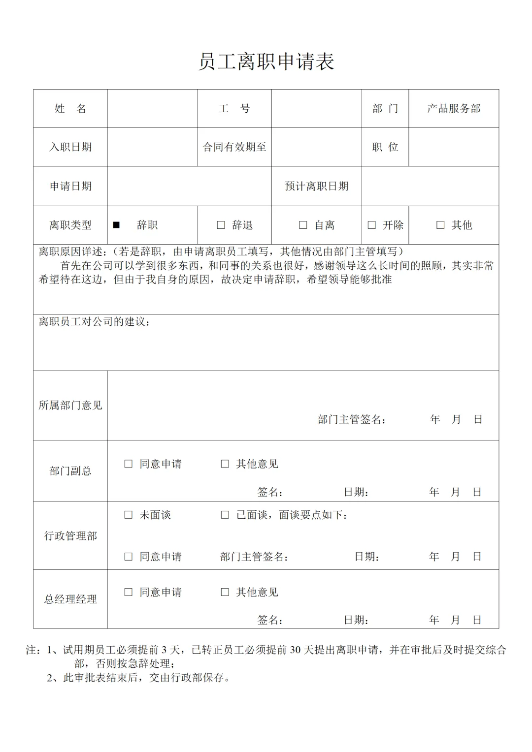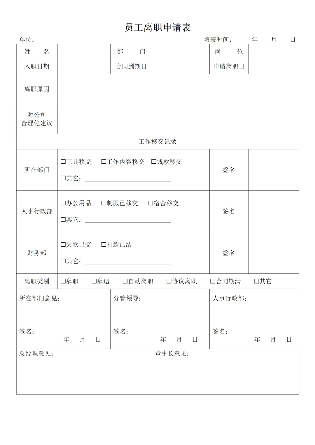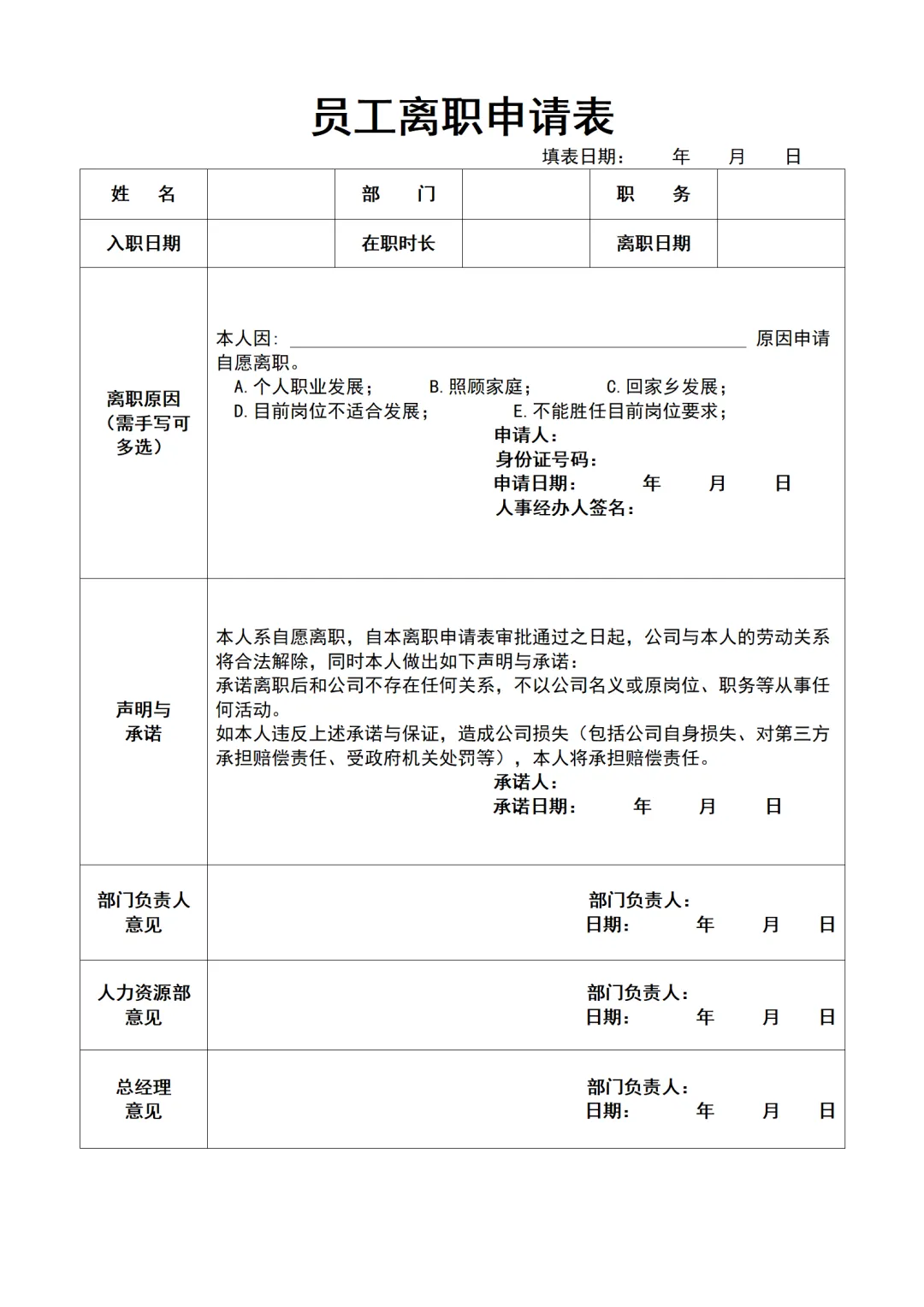为帮助员工规范表达离职意愿、协助HR高效处理手续,我整理了一系列实用模板,包含标准离职申请表和专业辞职信范例。