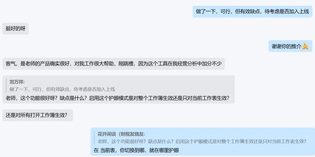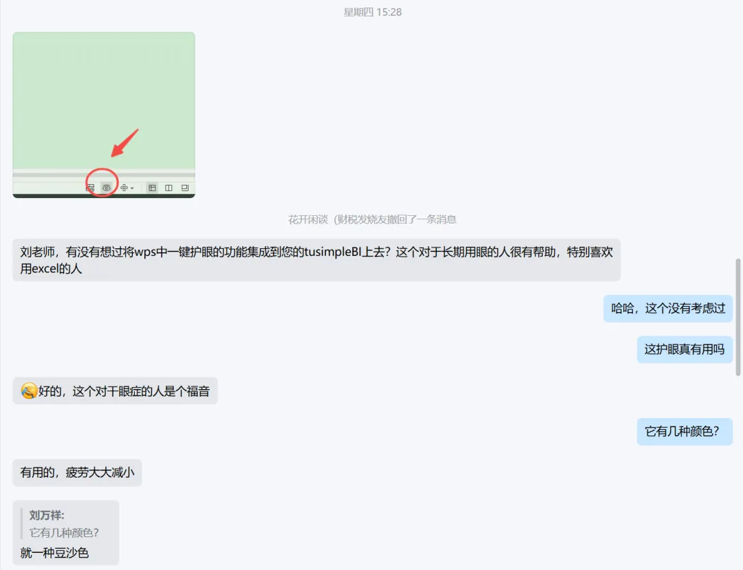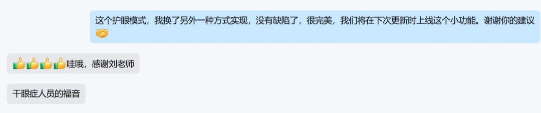 我们的用户朋友@花开闲谈 提建议,希望我们能增加类似 WPS 的护眼模式:▼