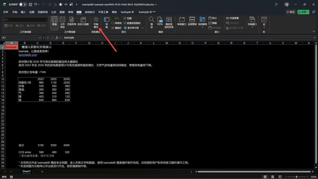在 365 版本中,当处于 黑色主题 的时候,在 视图 下会多出个深色模式-切换模式的按钮,可以把工作表也变成黑色:▼