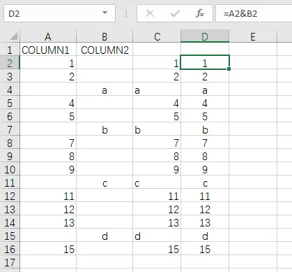我要把两列数据合并,也就是column2 插到column1里