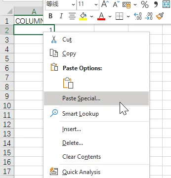 2.右键点击A2单元格,选择特殊粘贴