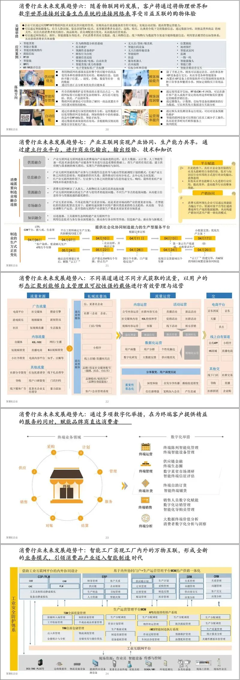 在全球数字经济浪潮的推动下,中国消费品与零售行业正迎来一场深刻的智能化变革。华润集团发布的《智慧消费白皮书》系统梳理了行业数字化转型的背景、趋势、框架与实践路径,为企业在复杂市场中找准方向提供了重要参考。白皮书指出,中国庞大的市场空间、持续的城镇化进程以及消费结构升级,为消费行业创造了前所未有的发展机遇。尤其在“十四五”期间,随着人均GDP突破1万美元、城镇化率向65%迈进,购物、医疗、教育等消费需求将持续扩大,供给体系的适配性提升与新技术赋能共同推动行业向高质量动态平衡迈进。 从国际视角看,美国、欧盟、日本等主要经济体均将数字经济作为战略重点,在人工智能、大数据、5G等领域加快布局。中国则通过政策引导与技术融合,推动数字经济规模从11万亿元增长至2020年的39.2万亿元,占GDP比重达38.6%。国家层面先后推出《关于推动实体零售创新转型的意见》《无人值守商店运营指引》等文件,鼓励企业应用大数据、云计算、物联网等技术,发展个性化定制、智能供应链、无接触消费等新模式,以智能化手段提升全链路效率。 消费行业的核心转型逻辑是从“以产品为中心”的传统链式价值链,转向“以消费者为中心”的环式价值网。在这一模式下,顾客数字化、商品数字化、渠道数字化与物流数字化共同构成智慧消费的四大支柱。企业通过数据洞察消费者行为,推动精准营销、场景互动和体验升级,同时依托C2M反向定制、一物一码、智慧供应链等技术,实现从生产端到消费端的高效协同。例如,华润万家通过数据共享平台打通零供数据链,实现供应链联合预测与营销协同;华润雪花则借助S&OP ONE平台统一全国产销计划,提升区域协同与成本控制能力。 白皮书进一步提出智慧消费的十大发展趋势,包括:世界级消费品牌的崛起、数字孪生技术在供应链决策中的应用、5G推动零售场景创新、AR/VR实现虚实融合体验、区块链提升商品追溯与交易可信度、物联网构建互联购物生态、产业互联网实现跨环节资源整合、私域流量运营成为增长新引擎、终端数字化赋能品牌直连消费者、智能工厂引领智能制造变革。这些趋势共同指向一个目标——通过数据驱动与技术赋能,实现人、货、场的全域数字化重构。 在实践层面,华润集团旗下多个业务单元已展开深入探索。华润万家通过数智化门店引入自助收银、电子价签、机器人巡检等黑科技,同时打造“万家APP”实现线上线下全渠道融合;华润雪花构建智能制造平台,实现酿造流程数字化与批次全生命周期管理;华润怡宝则通过智慧供应链平台实现端到端质量追溯与运力智能调度。这些案例表明,数字化转型不仅提升了运营效率,更重塑了企业与消费者的互动方式。 值得注意的是,智慧消费的建设并非一蹴而就。白皮书建议企业分三阶段推进:首先完成信息化与线上化基础建设,搭建数据中台与技术平台;随后重点突破业务数字化与局部智能化,形成数据驱动决策的能力;最终实现全产业链智能化覆盖,形成可对外输出的行业解决方案。在这一过程中,企业需注重顶层设计、资源投入与人才体系建设,以创新引领、科技引领、智能引领为核心策略,持续优化投入产出比。 总体而言,中国消费品与零售行业正处在从规模扩张向质量提升转型的关键阶段。智慧消费不仅是技术应用升级,更是商业模式、组织能力与产业生态的整体重构。华润集团通过本白皮书系统输出其转型经验,为同行企业提供了从战略规划到落地实施的全景参考。在“数字中国”战略引导下,以数据为关键要素、以智能技术为引擎的消费新时代已经到来。 接下来请您阅读下面的详细资料吧。