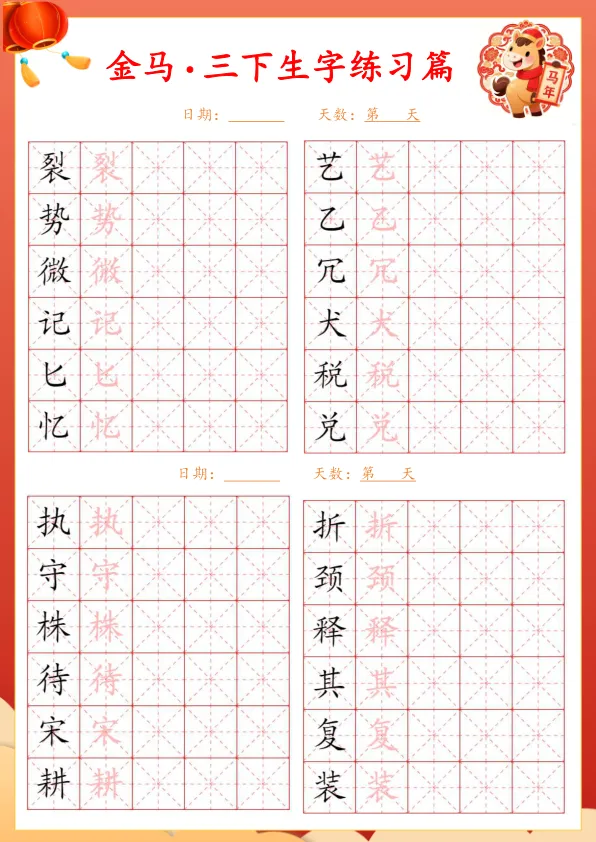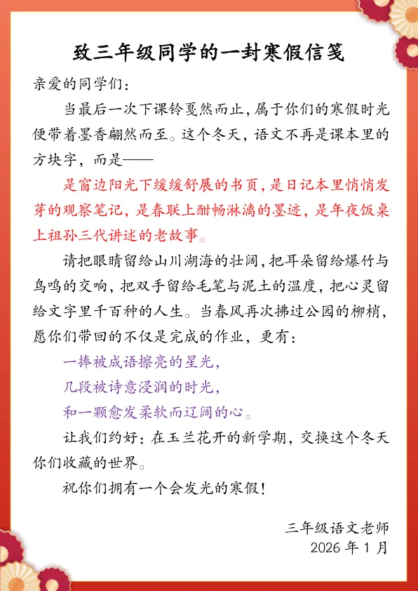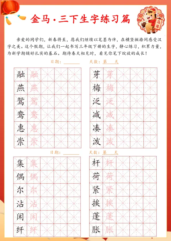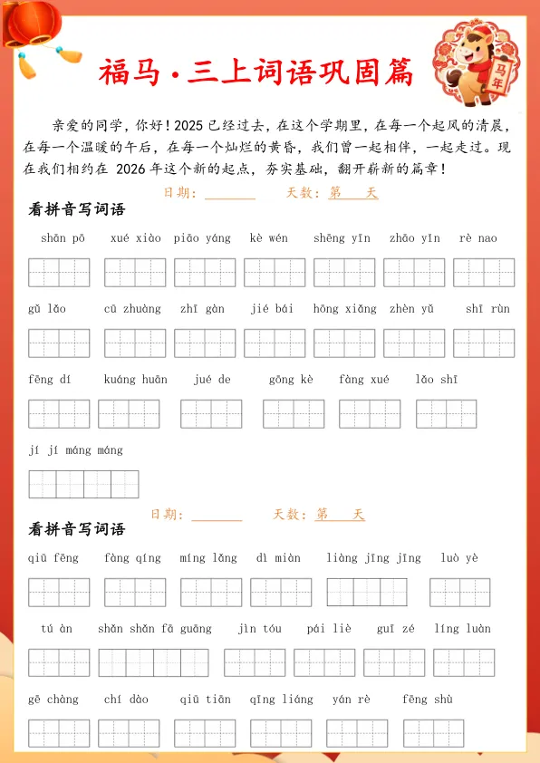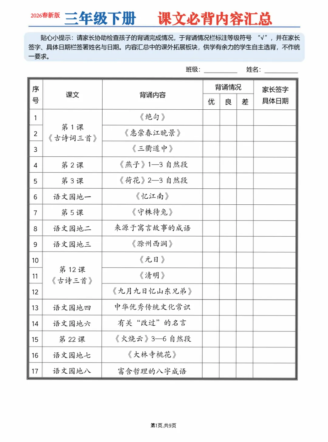 26春三年级语文寒假特色作业(word可修改)含字帖,必背内容