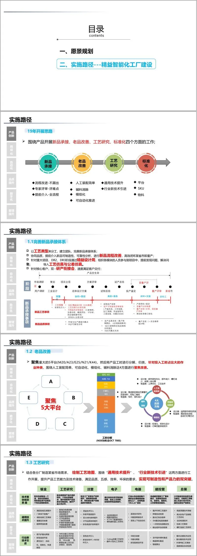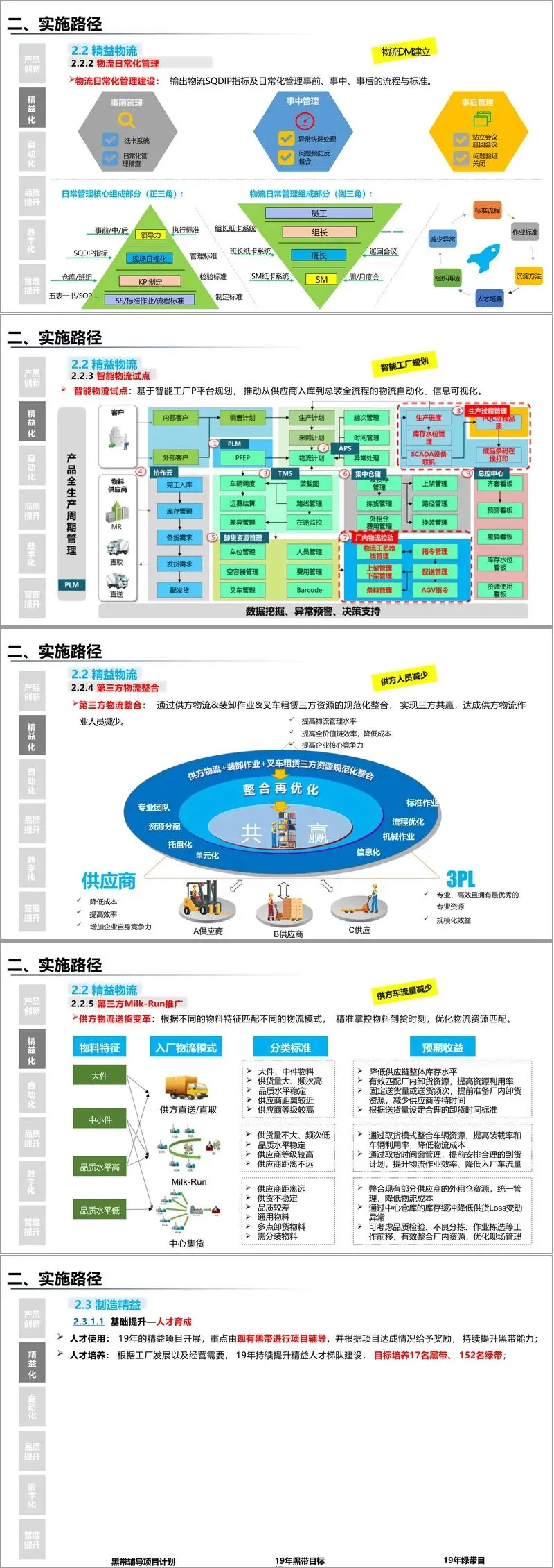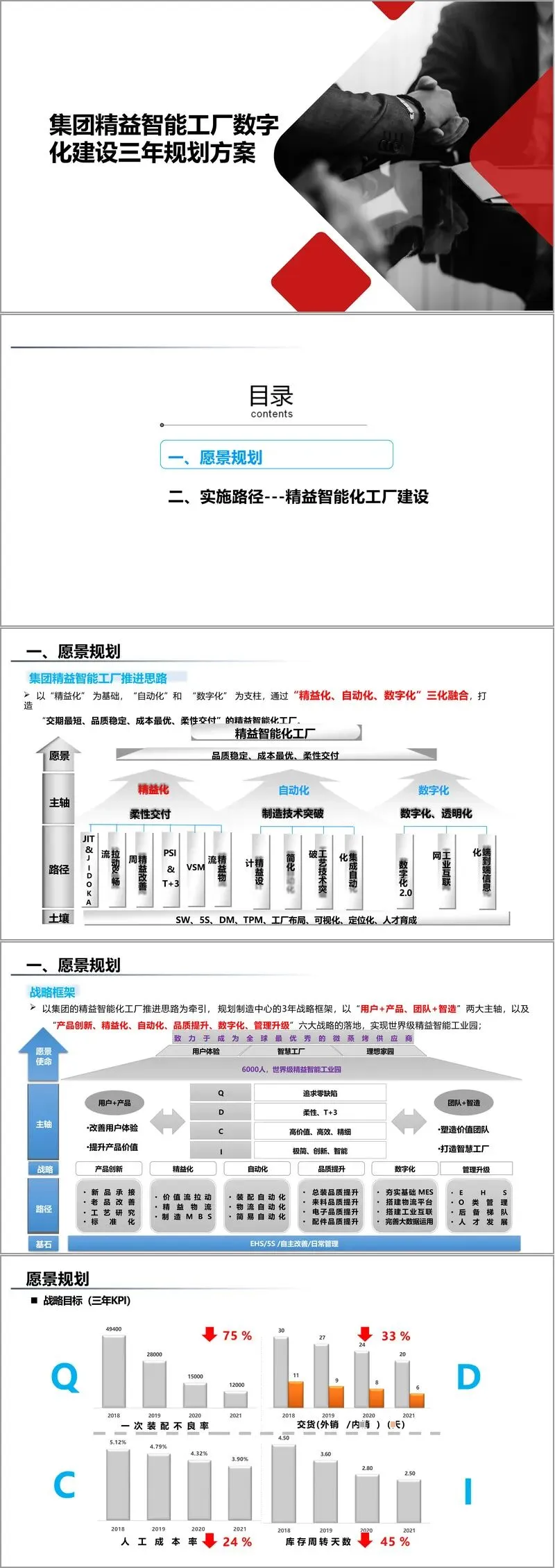 详细资料请看本解读文章的最后内容。 在制造业迈向工业4.0的浪潮中,数字化转型已不再是选择题,而是生存与发展的必由之路。近期,笔者深入研读了一份名为《集团精益智能工厂数字化建设三年规划方案》的重要文件。该方案系统性地勾勒出了一家大型制造集团未来三年如何通过“精益化、自动化、数字化”三化融合,打造世界级精益智能工业园的宏伟蓝图与实施路径。其内容之详实、逻辑之清晰、规划之前瞻,堪称制造业转型升级的一份典范之作。 该方案的灵魂在于其顶层设计。文件开宗明义地提出了核心推进思路:以“精益化”为坚实根基,以“自动化”和“数字化”为两大核心支柱,三者深度融合,最终实现“交期最短、品质稳定、成本最优、柔性交付”的终极目标。这一愿景并非空中楼阁,而是构建在一个清晰的战略框架之上。该框架以“用户+产品”和“团队+智造”为两大主轴,并具体分解为“产品创新、精益化、自动化、品质提升、数字化、管理升级”六大战略领域,确保了战略落地的全面性与协同性。 在具体的实施路径上,方案展现了极强的可操作性和阶段性。其规划并非一蹴而就,而是遵循了“点-线-面”的渐进式推进逻辑。首年(2019年)的工作重点在于夯实基础、试点突破。 产品创新方面,方案强调从源头抓起。新品承接体系致力于通过工艺团队前置介入、精益设计周、工艺仿真等手段,实现“不漏出、评难点、全流程”的高效闭环。对于已量产的老产品,则聚焦于核心平台,通过工时分解,针对性地在“人工装配简单化、可自动化推进、模组化、辅料消除”四个维度进行深度改善,体现了持续优化的精益思想。同时,工艺研究围绕通用技术提升和行业新技术引进双线并进,为产品力与可制造性的双突破储备技术动能。标准化工作则设定了明确的量化目标,旨在通过平台、SKU和物料编码的精简与管理,从根本上提升运营效率。 制造价值链的精益化转型是方案的基石。文件基于对现状价值流的深刻分析,制定了详尽的改善路径。在价值流拉动层面,旨在建立完善的PSI(生产、销售、库存)计划体系,通过S&OP(销售与运营规划)精细化管理,拉通产销价值链,实现T+3模式的订单透明化与高效交付。同时,通过优化电子、电器等分厂与总装线的型谱匹配,建立连续流试点,并设定钣金、注塑等环节库存下降30%的挑战性目标,旨在显著缩短物流路径,减少库存资金占用。精益物流板块则聚焦于基础优化、日常化管理体系构建、智能物流试点(如AGV、输送链应用)以及第三方物流整合与Milk-Run(循环取货)模式的推广,以降低入厂车流量,提升整体物流效率。制造现场的精益转换(MBS)则更具针对性,各分厂依据自身特点确立了主攻方向:钣金分厂聚焦品质防错体系建设,注塑分厂致力于成型周期缩短,总装分厂则着力于连续流构建与高效工厂打造,东芝分厂探索高端品的柔性制造升级。专项改善如物料手边化(POU)覆盖率的提升,更是将改善落实到每一个工位。 自动化与智能化作为支柱之一,其规划路径清晰可见。方案规划在总装、钣金、注塑、电子、物流等各领域分阶段推进自动化。例如,总装P平台自动化线的建设与复制,旨在实现单线大幅减员;钣金焊接全自动线的投入,将改变传统作业模式;物流环节的自动配送线(如A2-C2腔体悬挂链)则能有效减轻员工作业强度,提升配送效率。尤为值得一提的是“简化”项目,它超越单纯的设备替代,从品质防错、直接减员、效率提升三个维度系统推进,设定了年度减员300人和简化覆盖率提升30%的硬性指标,体现了通过技术和管理手段追求极致效率的决心。品质提升作为核心目标,其策略实现了从被动检验到主动预防的转变。方案旨在推动“保姆式”品质向“自主”品质过渡。具体措施包括:在新品阶段导入NPI(新产品导入)管理;在过程控制中大幅提升CTQ(关键质量特性)工序的防错覆盖率,预防制程批量事故;在来料端,通过对TOP物料和TOP供方的专项改善与体系提升,降低外部质量风险。同时,通过建立成品可靠性测试(ORT)、完善变更管理机制、以及在基层班组构建“铁三角”品质体系,将质量责任内建到每一个环节,最终实现市场投诉与批量事故的显著下降。 数字化建设是赋能前三者的“大脑”与“神经网络”。方案直面当前各系统数据孤岛、物流平台不完整、工业互联网应用缺失等痛点,规划了系统的建设路径。其核心在于夯实各工厂制造执行系统(MES)的基础,并在此基础上,构建智能物流平台以实现实物流与信息流的同步,搭建工业互联网平台以实现设备数据的集成、监控与能源的智能管控。最终,通过对生产、物流、经营等大数据的挖掘与应用,实现订单进度透明化、关键绩效指标(KPI)实时监控与智能决策分析,为管理经营提供精准支持,并为未来迈向C2M个性化定制奠定基础。管理升级作为软实力的保障,同样不可或缺。方案在环境、健康与安全(EHS)领域设定了红线事件为零的严格目标,并规划了对重大风险源的彻底整治。在人员管理(O类)上,通过三级面谈、工龄工资、效率分享、环境改善等综合措施,力求降低高流失率,并严控人工成本。在人才发展方面,方案注重后备梯队建设与职业发展路径的清晰化,特别提出要弥补制造技术工艺类人才的短板,为智能化转型储备核心人力资本。 通览全篇,这份三年规划方案不仅是
