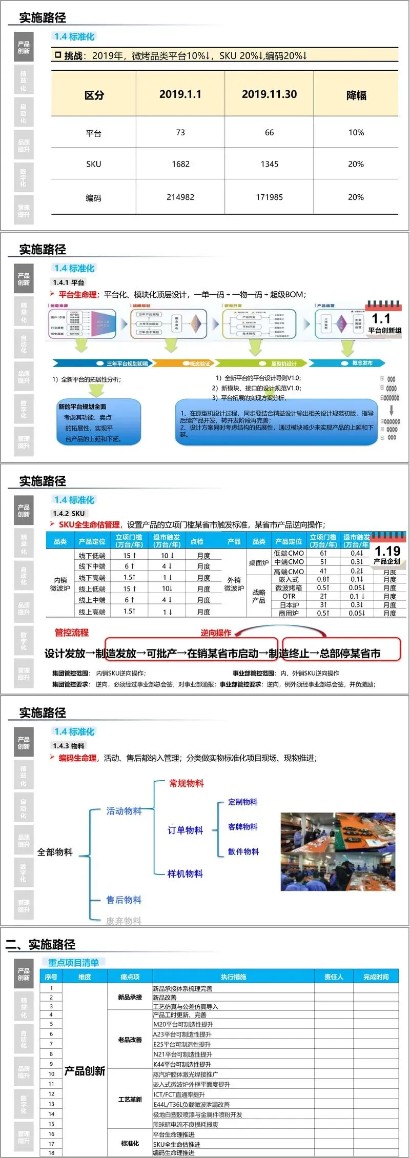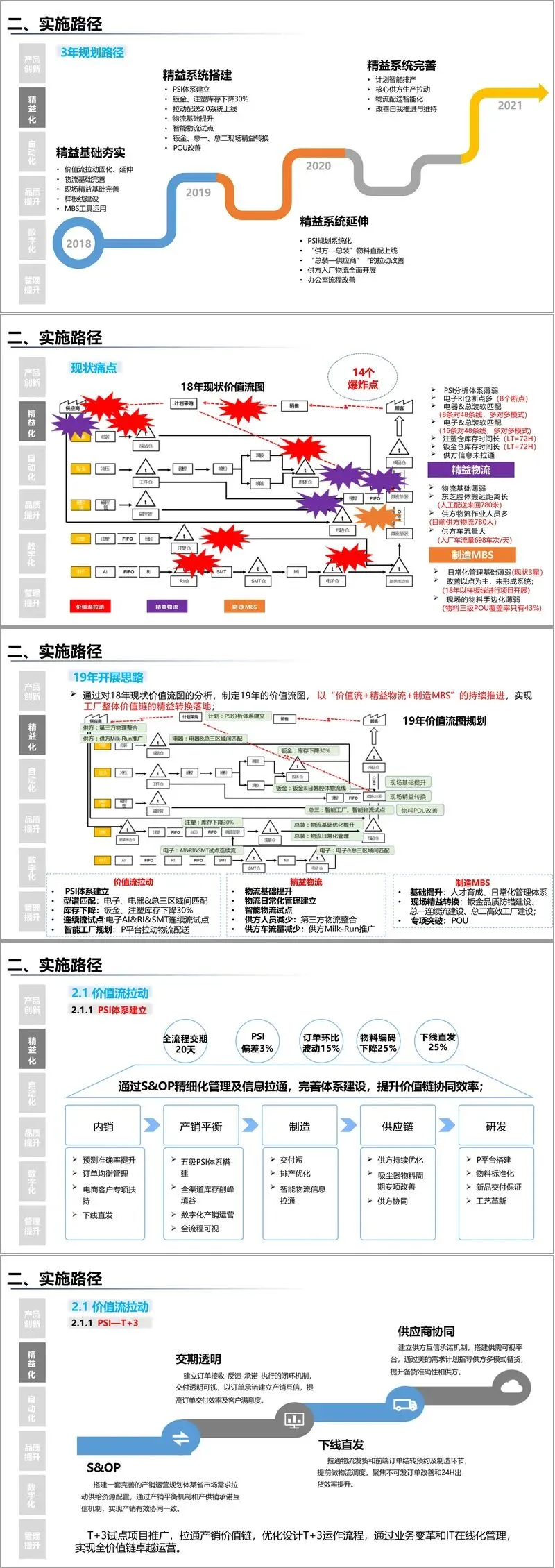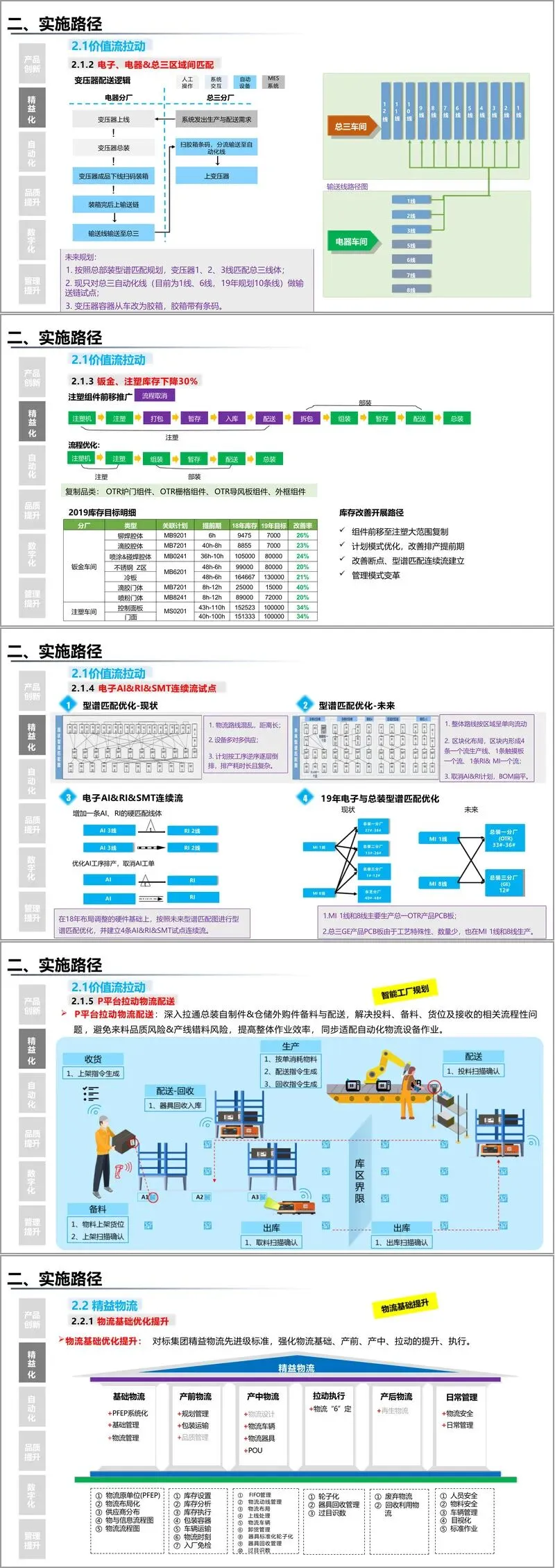 详细资料请看本解读文章的最后内容。 在制造业迈向工业4.0的浪潮中,数字化转型已不再是选择题,而是生存与发展的必由之路。近期,笔者深入研读了一份名为《集团精益智能工厂数字化建设三年规划方案》的重要文件。该方案系统性地勾勒出了一家大型制造集团未来三年如何通过“精益化、自动化、数字化”三化融合,打造世界级精益智能工业园的宏伟蓝图与实施路径。其内容之详实、逻辑之清晰、规划之前瞻,堪称制造业转型升级的一份典范之作。 该方案的灵魂在于其顶层设计。文件开宗明义地提出了核心推进思路:以“精益化”为坚实根基,以“自动化”和“数字化”为两大核心支柱,三者深度融合,最终实现“交期最短、品质稳定、成本最优、柔性交付”的终极目标。这一愿景并非空中楼阁,而是构建在一个清晰的战略框架之上。该框架以“用户+产品”和“团队+智造”为两大主轴,并具体分解为“产品创新、精益化、自动化、品质提升、数字化、管理升级”六大战略领域,确保了战略落地的全面性与协同性。 在具体的实施路径上,方案展现了极强的可操作性和阶段性。其规划并非一蹴而就,而是遵循了“点-线-面”的渐进式推进逻辑。首年(2019年)的工作重点在于夯实基础、试点突破。 产品创新方面,方案强调从源头抓起。新品承接体系致力于通过工艺团队前置介入、精益设计周、工艺仿真等手段,实现“不漏出、评难点、全流程”的高效闭环。对于已量产的老产品,则聚焦于核心平台,通过工时分解,针对性地在“人工装配简单化、可自动化推进、模组化、辅料消除”四个维度进行深度改善,体现了持续优化的精益思想。同时,工艺研究围绕通用技术提升和行业新技术引进双线并进,为产品力与可制造性的双突破储备技术动能。标准化工作则设定了明确的量化目标,旨在通过平台、SKU和物料编码的精简与管理,从根本上提升运营效率。 制造价值链的精益化转型是方案的基石。文件基于对现状价值流的深刻分析,制定了详尽的改善路径。在价值流拉动层面,旨在建立完善的PSI(生产、销售、库存)计划体系,通过S&OP(销售与运营规划)精细化管理,拉通产销价值链,实现T+3模式的订单透明化与高效交付。同时,通过优化电子、电器等分厂与总装线的型谱匹配,建立连续流试点,并设定钣金、注塑等环节库存下降30%的挑战性目标,旨在显著缩短物流路径,减少库存资金占用。精益物流板块则聚焦于基础优化、日常化管理体系构建、智能物流试点(如AGV、输送链应用)以及第三方物流整合与Milk-Run(循环取货)模式的推广,以降低入厂车流量,提升整体物流效率。制造现场的精益转换(MBS)则更具针对性,各分厂依据自身特点确立了主攻方向:钣金分厂聚焦品质防错体系建设,注塑分厂致力于成型周期缩短,总装分厂则着力于连续流构建与高效工厂打造,东芝分厂探索高端品的柔性制造升级。专项改善如物料手边化(POU)覆盖率的提升,更是将改善落实到每一个工位。 自动化与智能化作为支柱之一,其规划路径清晰可见。方案规划在总装、钣金、注塑、电子、物流等各领域分阶段推进自动化。例如,总装P平台自动化线的建设与复制,旨在实现单线大幅减员;钣金焊接全自动线的投入,将改变传统作业模式;物流环节的自动配送线(如A2-C2腔体悬挂链)则能有效减轻员工作业强度,提升配送效率。尤为值得一提的是“简化”项目,它超越单纯的设备替代,从品质防错、直接减员、效率提升三个维度系统推进,设定了年度减员300人和简化覆盖率提升30%的硬性指标,体现了通过技术和管理手段追求极致效率的决心。品质提升作为核心目标,其策略实现了从被动检验到主动预防的转变。方案旨在推动“保姆式”品质向“自主”品质过渡。具体措施包括:在新品阶段导入NPI(新产品导入)管理;在过程控制中大幅提升CTQ(关键质量特性)工序的防错覆盖率,预防制程批量事故;在来料端,通过对TOP物料和TOP供方的专项改善与体系提升,降低外部质量风险。同时,通过建立成品可靠性测试(ORT)、完善变更管理机制、以及在基层班组构建“铁三角”品质体系,将质量责任内建到每一个环节,最终实现市场投诉与批量事故的显著下降。 数字化建设是赋能前三者的“大脑”与“神经网络”。方案直面当前各系统数据孤岛、物流平台不完整、工业互联网应用缺失等痛点,规划了系统的建设路径。其核心在于夯实各工厂制造执行系统(MES)的基础,并在此基础上,构建智能物流平台以实现实物流与信息流的同步,搭建工业互联网平台以实现设备数据的集成、监控与能源的智能管控。最终,通过对生产、物流、经营等大数据的挖掘与应用,实现订单进度透明化、关键绩效指标(KPI)实时监控与智能决策分析,为管理经营提供精准支持,并为未来迈向C2M个性化定制奠定基础。管理升级作为软实力的保障,同样不可或缺。方案在环境、健康与安全(EHS)领域设定了红线事件为零的严格目标,并规划了对重大风险源的彻底整治。在人员管理(O类)上,通过三级面谈、工龄工资、效率分享、环境改善等综合措施,力求降低高流失率,并严控人工成本。在人才发展方面,方案注重后备梯队建设与职业发展路径的清晰化,特别提出要弥补制造技术工艺类人才的短板,为智能化转型储备核心人力资本。 通览全篇,这份三年规划方案不仅是