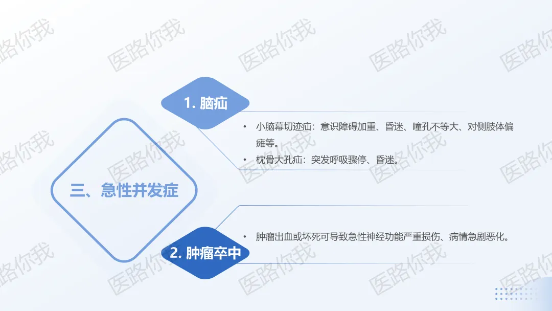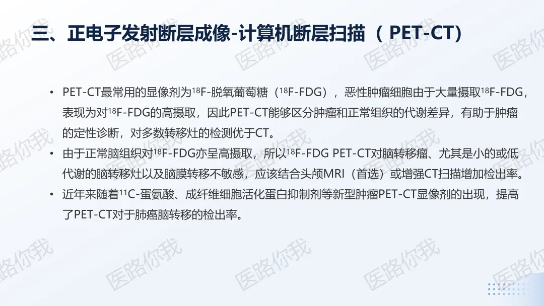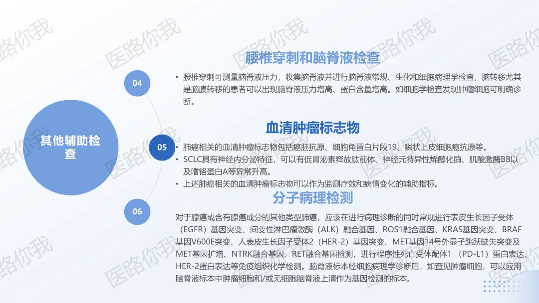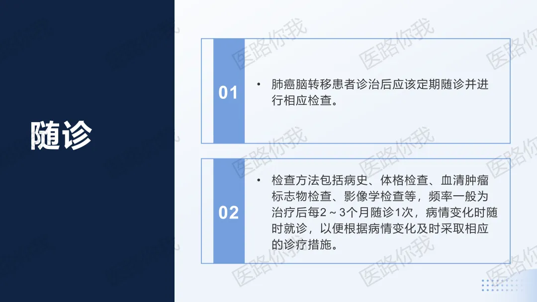 肺癌脑转移患者诊治后应该定期随诊并进行相应检查。检查方法包括病史、体格检查、血清肿瘤标志物检查、影像学检查等,频率一般为治疗后每2~3个月随诊1次,病情变化时随时就诊,以便根据病情变化及时采取相应的诊疗措施。