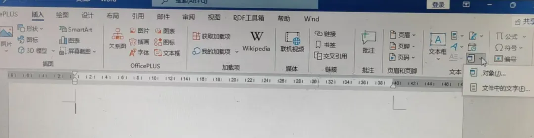 Word 2016及以上版本:点击顶部菜单栏“插入” → 选择“对象”下拉箭头 → 点击“文件中的文字”。