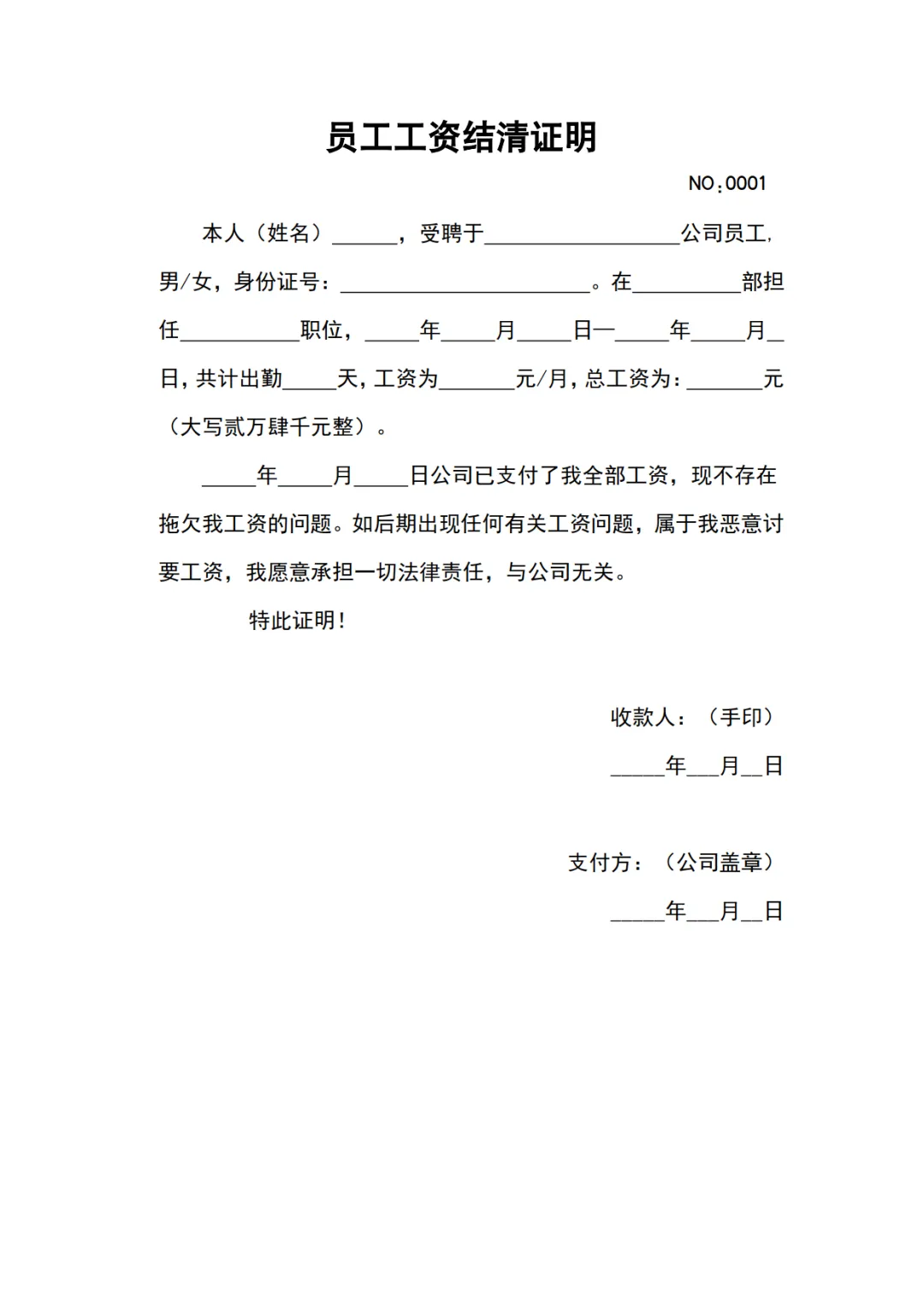 >员工工资结清证明模板,WORD文档电子版,可免费下载打印