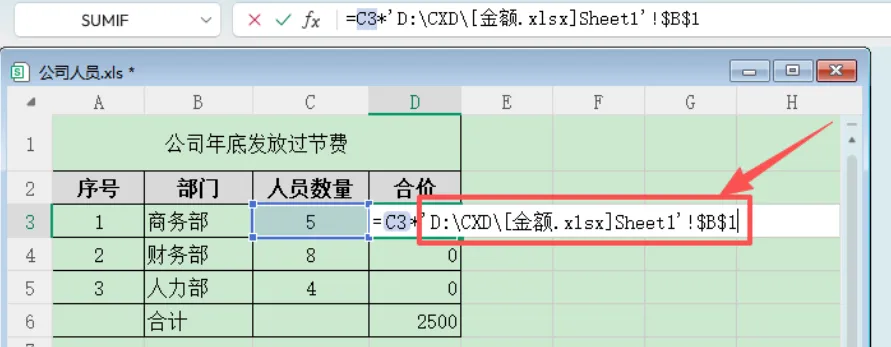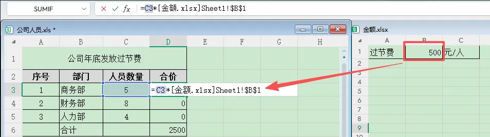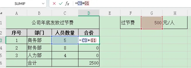 公司年底发放过节费,每人 500元,需要统计各部门总金额。